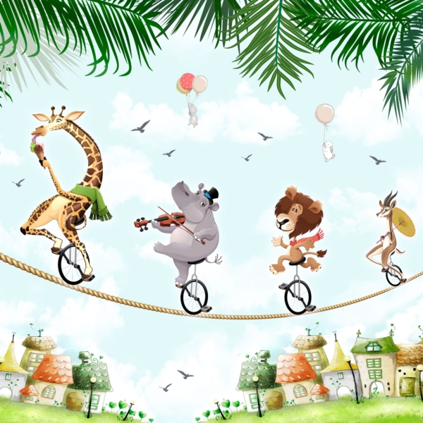 - Ref. proizvoda: 12050292783 Dizajniran za najmlađe, ovaj mural prikazuje životinje koje plešu na užetu. Uključuje, između ostalih, nilskog konja i žirafu. Boje su odabrane tako da fototapete imaju univerzalni karakter. To znači da se može koristiti za uređenje i djevojačke i dječačke sobe. Svi elementi na njemu su jasni i svidjet će se svakom djetetu. Odabirom ovog zidnog zidnog zida…