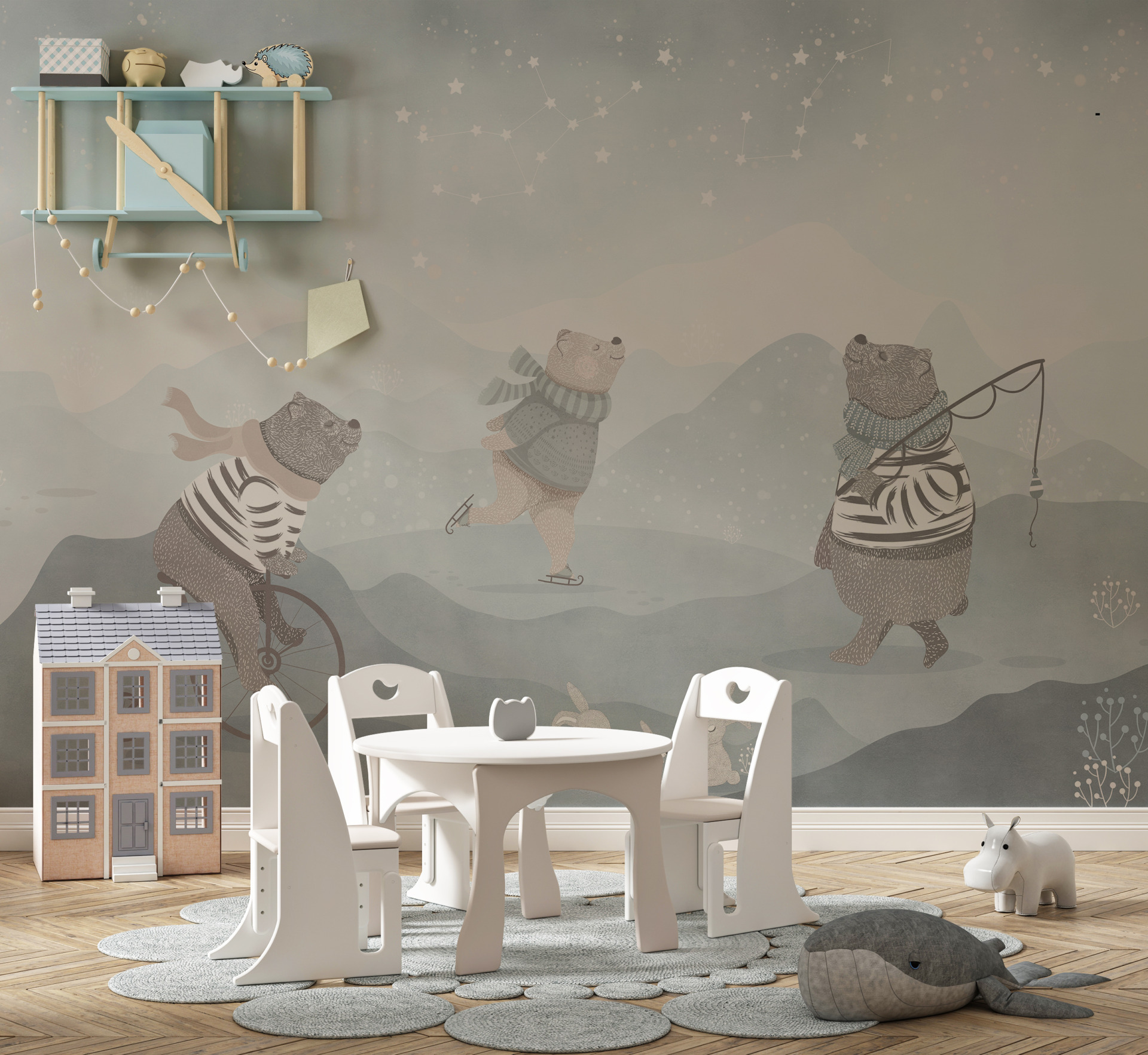 Ovaj slatki zidni mural prikazuje skupinu plišanih medvjedića odjevenih u šarene šalove koji im dodaju šarm i toplinu. Savršeno za dječju sobu ili bilo koji interijer u kojem želite dodati dašak radosti i šarma.