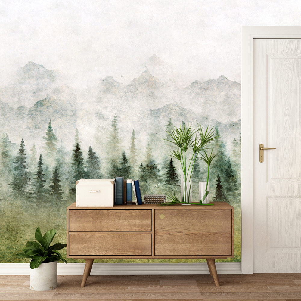 Predstavljeni krajolik prikazuje gustu crnogoričnu šumu, čiji krošnje drveća postupno nestaju u laganoj magli, dok se u pozadini naziru mirne planinske siluete. Prirodna paleta zelenih, sivih i bež tonova čini da se ova akvarelna slika šume u magli savršeno uklapa u trenutne trendove uređenja interijera inspirirane prirodom, skandinavskim, japanskim i boho stilovima.