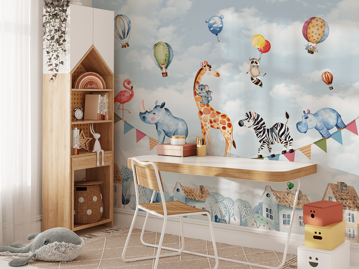 Stvorite jedinstvenu atmosferu u dječjoj sobi uz foto tapetu “Balancing Safari”. Ova šarmantna, šarena ilustracija prikazuje prijateljske životinje – žirafu, zebru, nosoroga i druge – kako se igraju na užetu s veselim zastavama i balonima koji lebde na pozadini svijetloplavog neba. Ovaj prizor, pun topline i fantazije, potaknut će dječju maštu i unijeti radost i mir u interijer.