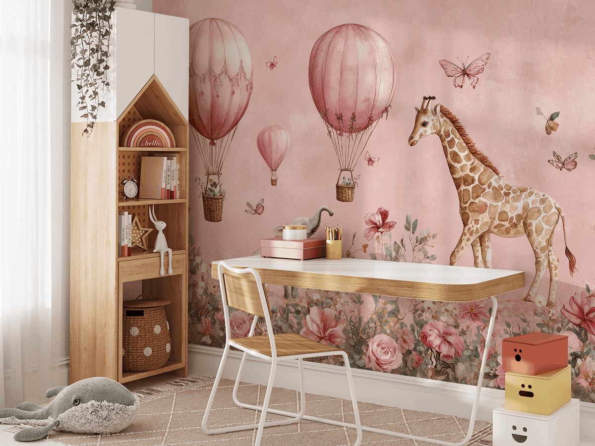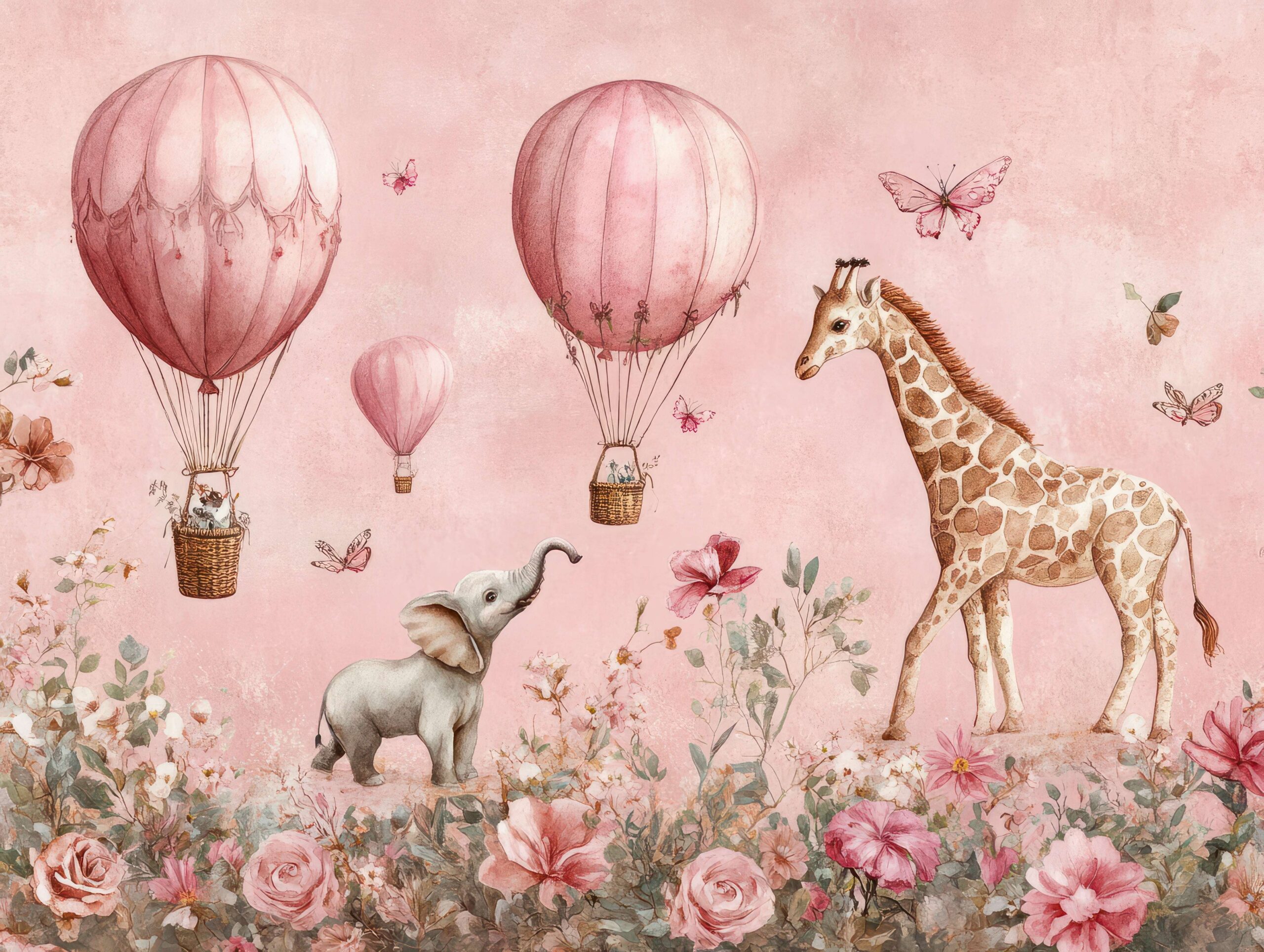 Unesite čarobnu atmosferu u dječju sobu foto tapetom “Balonski safari”. Ova šarmantna i nježna ilustracija prikazuje slonića i žirafu okružene ružičastim balonima i cvijećem koji mališane prenose u svijet pun zabave i mašte. Pastelne boje i prijateljske životinje stvaraju toplu, ugodnu atmosferu, savršenu za dječji prostor.