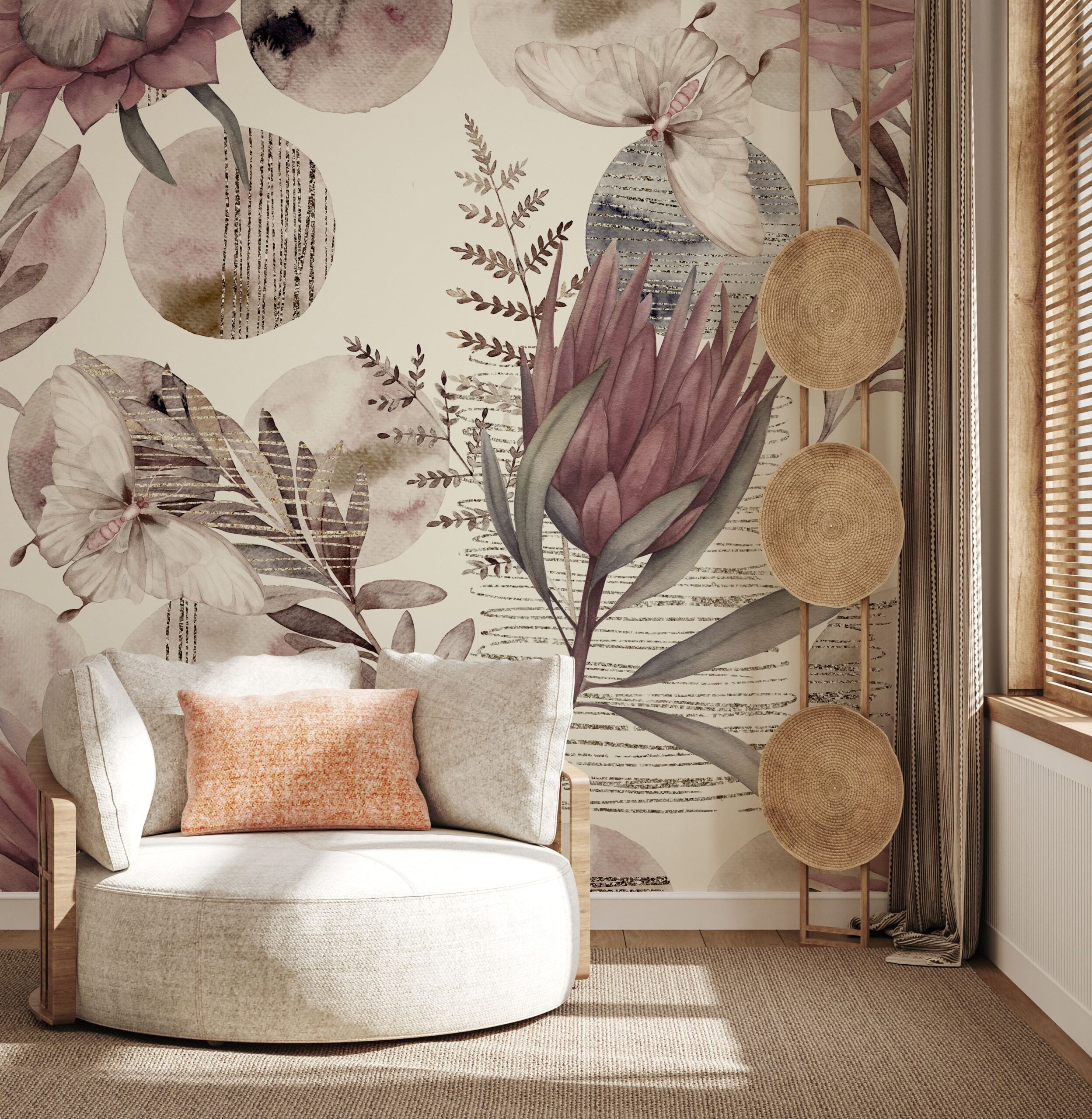 Unesite jedinstvenu atmosferu u svoj interijer uz zidnu fototapetu “Botanička melodija”. Ovaj nježni, akvarelni uzorak inspiriran prirodom kombinira motive cvijeća, lišća i leptira s mekim, prigušenim bojama ružičaste, bež i sive. Obogaćena zlatnim detaljima i grafičkim teksturama, kompozicija stvara elegantnu i atmosferičnu atmosferu punu gracioznosti.