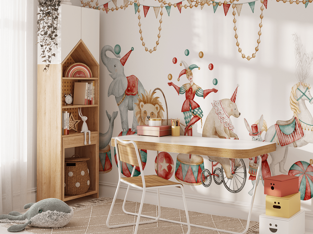 Pretvorite dječju sobu u izvanrednu arenu punu smijeha i avanture uz foto tapetu “Cirkus životinjskih talenata”. Ova šarmantna ilustracija u pastelnim bojama prikazuje cirkuske životinje u zabavnim ulogama – od plesajućih tuljana i plišanih medvjedića koji voze bicikle do elegantnog lava koji skače kroz obruč. Prati ih veseli klaun i radosna povorka likova koji će vašeg mališana prenijeti u svijet cirkuske magije.