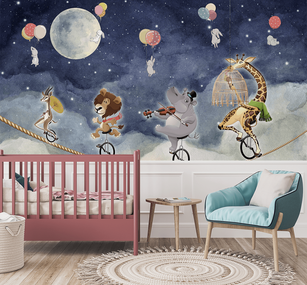 Zaronite u čarobni svijet snova uz zidnu fototapetu “Cirkuška noć iznad oblaka”. Ovaj šarmantni, šareni motiv prikazuje veselu povorku cirkuskih životinja koje balansiraju na žici iznad oblaka – među zvijezdama, balonima i svjetlećim mjesecom. Zečevi koji skaču, žirafa koja jede sladoled ili nilski konj koji svira violinu – svaki detalj poziv je na igru i razvoj dječje mašte.