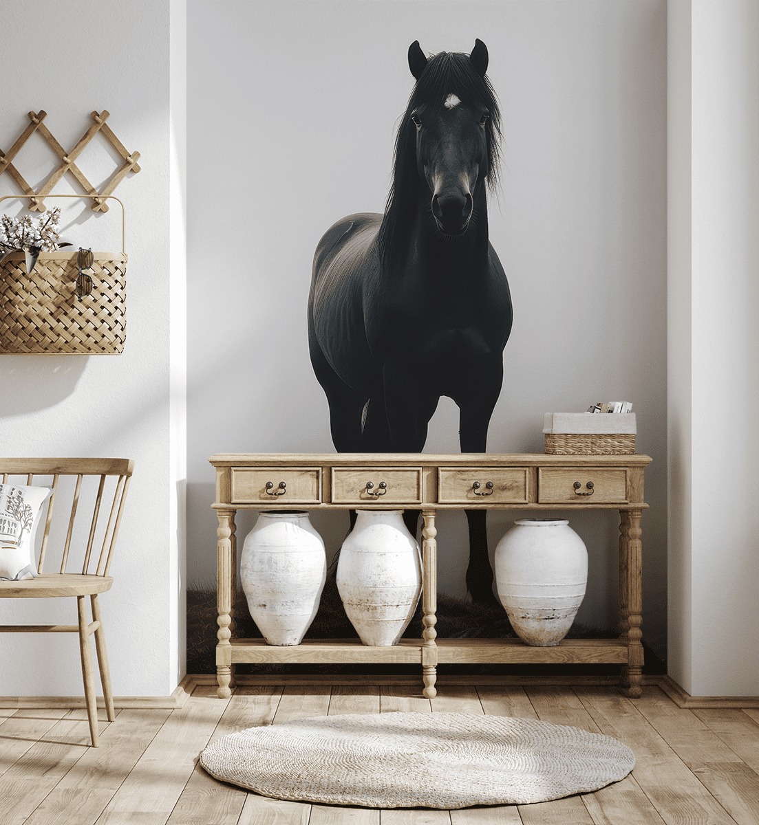 Unesite jedinstvenu atmosferu u svoj interijer foto tapetom “Crni konj”. Ova dirljiva, duboka kompozicija prikazuje snagu i ljepotu konja koji stoji na pozadini nježne magle, stvarajući sliku punu mira i divlje prirode. Kontrastna kombinacija tamne siluete na svijetloj pozadini privlači pogled i unosi dašak misterije i elegancije u prostoriju.