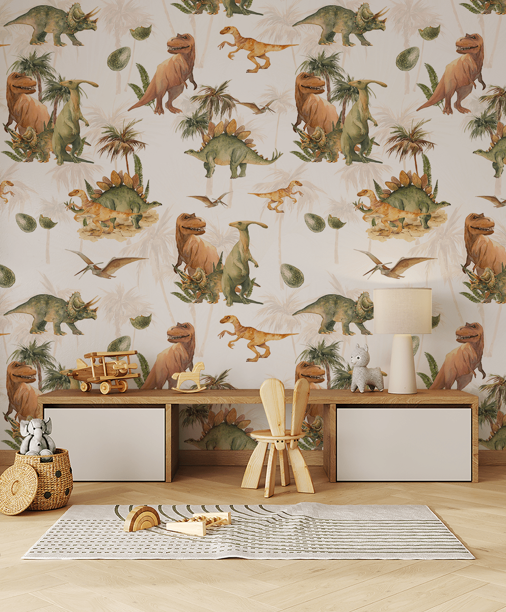 Pretvorite dječju sobu u fascinantnu zemlju punu avantura uz foto tapetu “Dinosauri iz džungle”. Ovaj šareni, živahni uzorak prenosi vaše mališane u srce drevne džungle, dom prijateljskih dinosaura, egzotičnih biljaka i tajanstvenih jaja dinosaura. Svaki detalj dizajniran je imajući na umu dječju maštu – od nasmijanih tiranosaura do veličanstvenih stegosaura i letećih pterosaura.