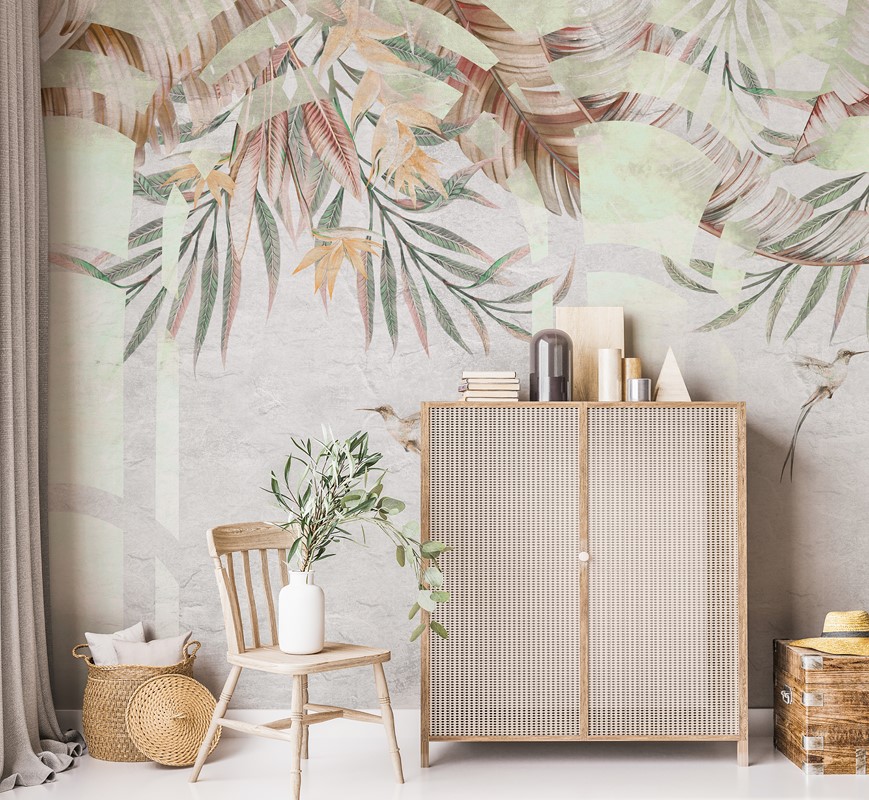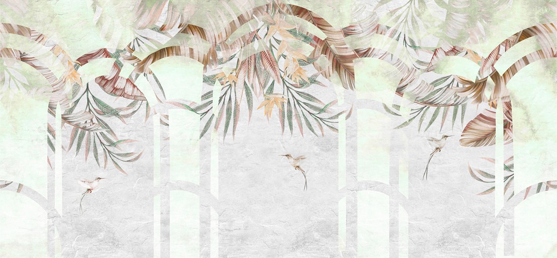 Oznake Biljke, Cvijeće, egzotično, egzotično u interijeru, geometrijski lukovi, ptice, tapeta s biljkama, tapeta s tropskim lišćem, tapeta za dnevni boravak, tapeta za spavaću sobu, tropsko lišće, ukrasni lukovi
