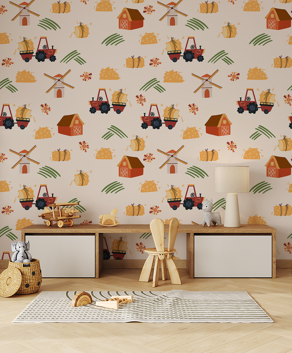 Prenesite se u mirni svijet svakodnevnog seoskog života s foto tapetama “Farm Harmony”. Ovaj šarmantni uzorak s motivima traktora, mlinova, štala i plastova sijena stvara toplu, prijateljsku atmosferu punu prirodnog sklada i jednostavnosti. Prigušene, tople boje donose mir i ravnotežu, idealne za stvaranje prostora koji pogoduje opuštanju i spokoju.