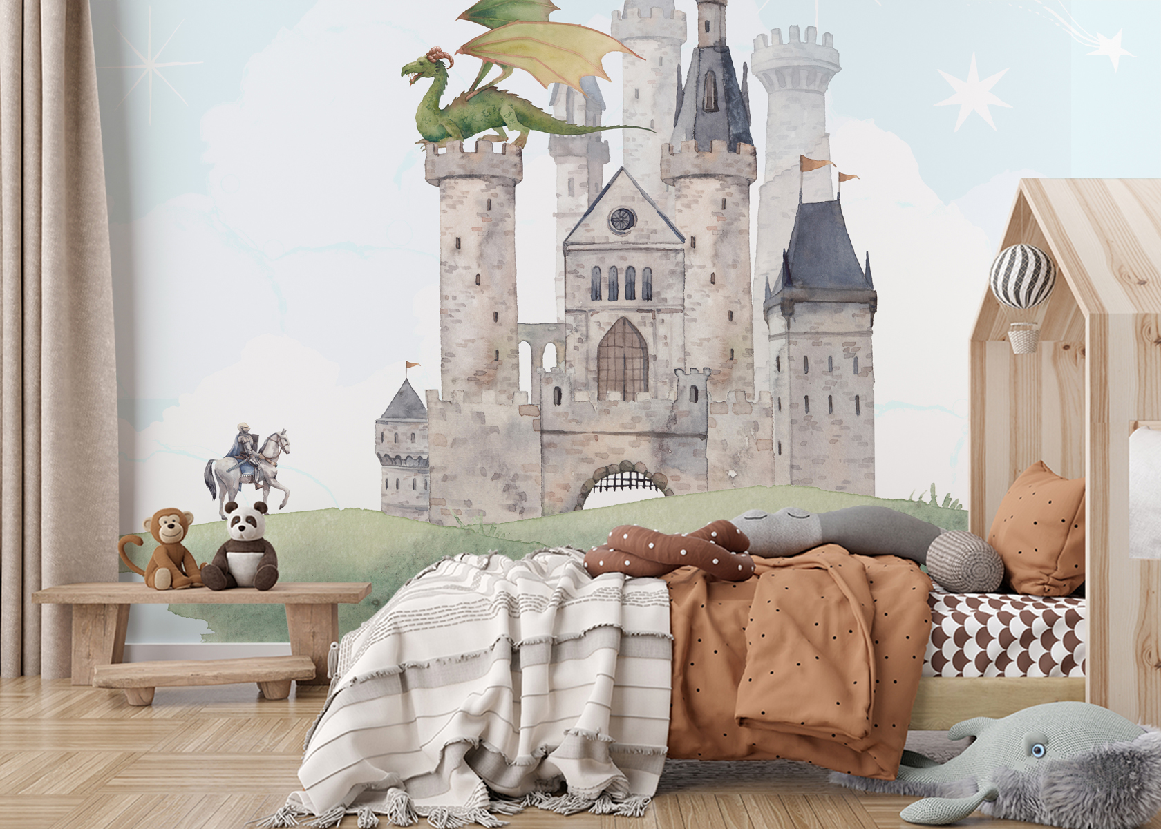 Žirkljaste boje, pastelne nijanse plave i zelene te svijetli, ručno oslikani detalji znače da zidna slika za djecu s akvarelnim zmajem i dvorcem ne preopterećuje prostor, a istovremeno potiče maštu i kreativnost. Motiv bajkovitog dvorca potiče igru, pripovijedanje i stvaranje vlastitih avantura.