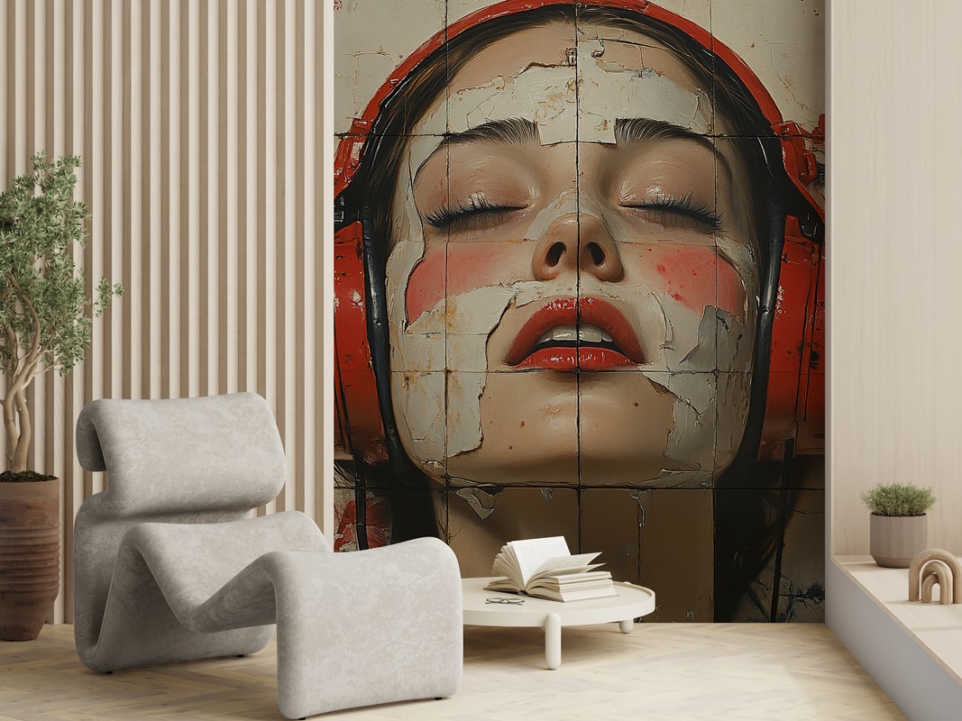 Foto tapeta “Musical Mosaic Dream” jedinstvena je kombinacija portretne umjetnosti s modernim mozaičkim oblikom. Središnji motiv je žensko lice sa slušalicama – fokusirano, kao da je uronjeno u zvukove, uvodi vas u intimni, emocionalni svijet glazbe. Kompozicija je podijeljena na ravnomjerne kvadrate koji stvaraju umjetnički mozaični efekt, podsjećajući na kolaž fragmenata zvukova, sjećanja i emocija.