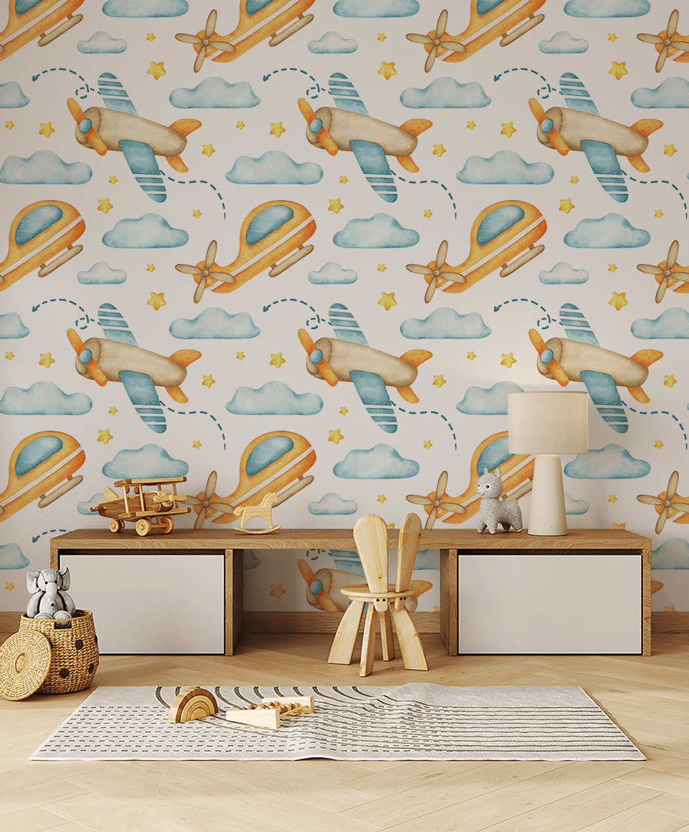 Unesite čarobnu atmosferu u dječju sobu foto tapetom “Cloud Flights”. Ova šarmantna, akvarelna grafika s avionima, mekim oblacima i zvijezdama prenijet će vašeg mališana u svijet bezbrižnih letova i snova o nebu. Svijetle, tople boje i nježni detalji stvaraju prostor pun radosti i mašte, savršen za dječju spavaću sobu ili kutak za igru.