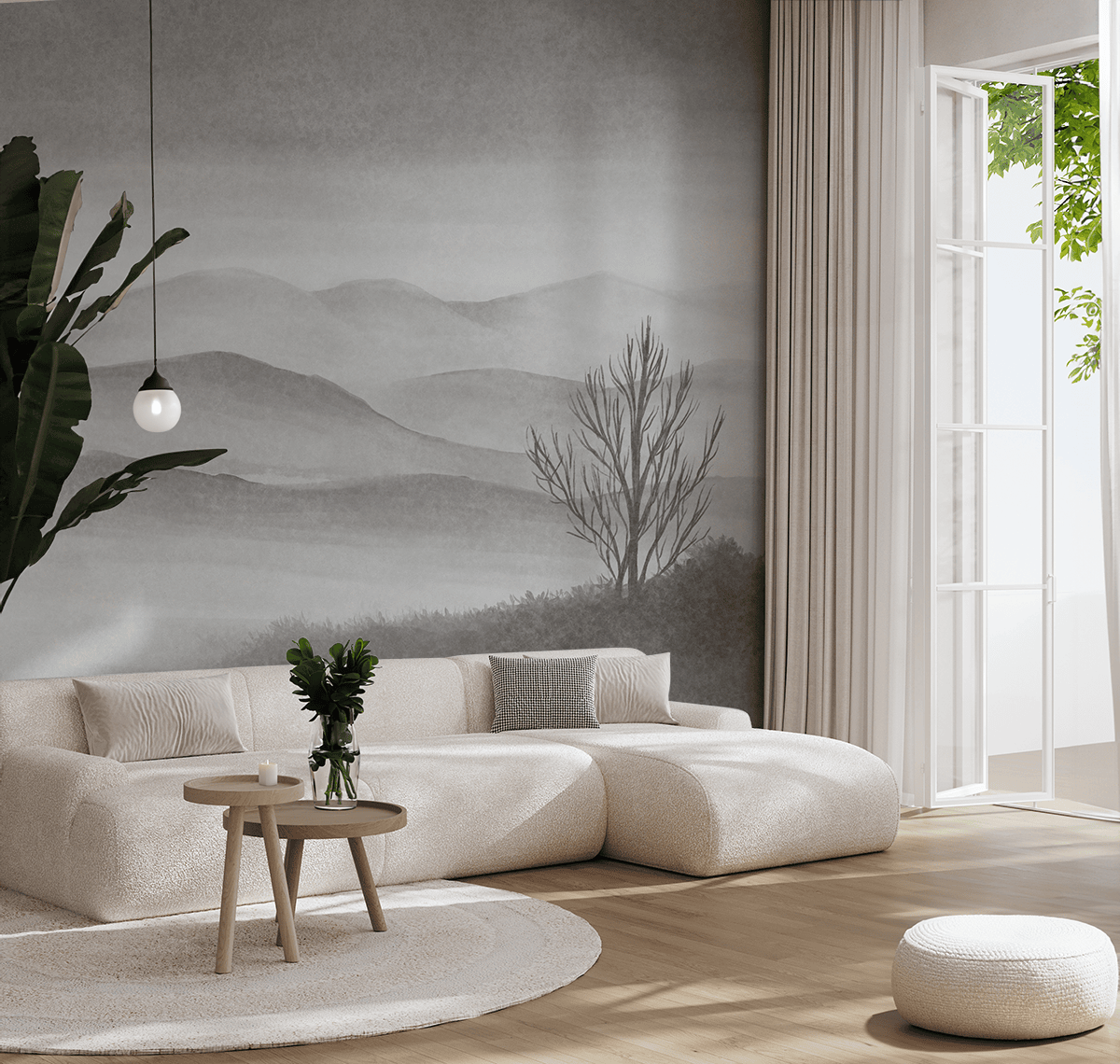 Unesite izvanredan mir u svoj dom uz foto tapetu “Misty Tranquility”. Ovaj slikoviti krajolik, koji prikazuje maglu koja obavija planine i usamljeno drvo, stvara atmosferu tišine i razmišljanja, savršeno nadopunjujući minimalistički i prigušeni stil interijera. Dobro osmišljeni sivi i bijeli tonovi dodaju eleganciju i stvaraju suptilan, gotovo meditativan prostor koji potiče opuštanje i spokoj.