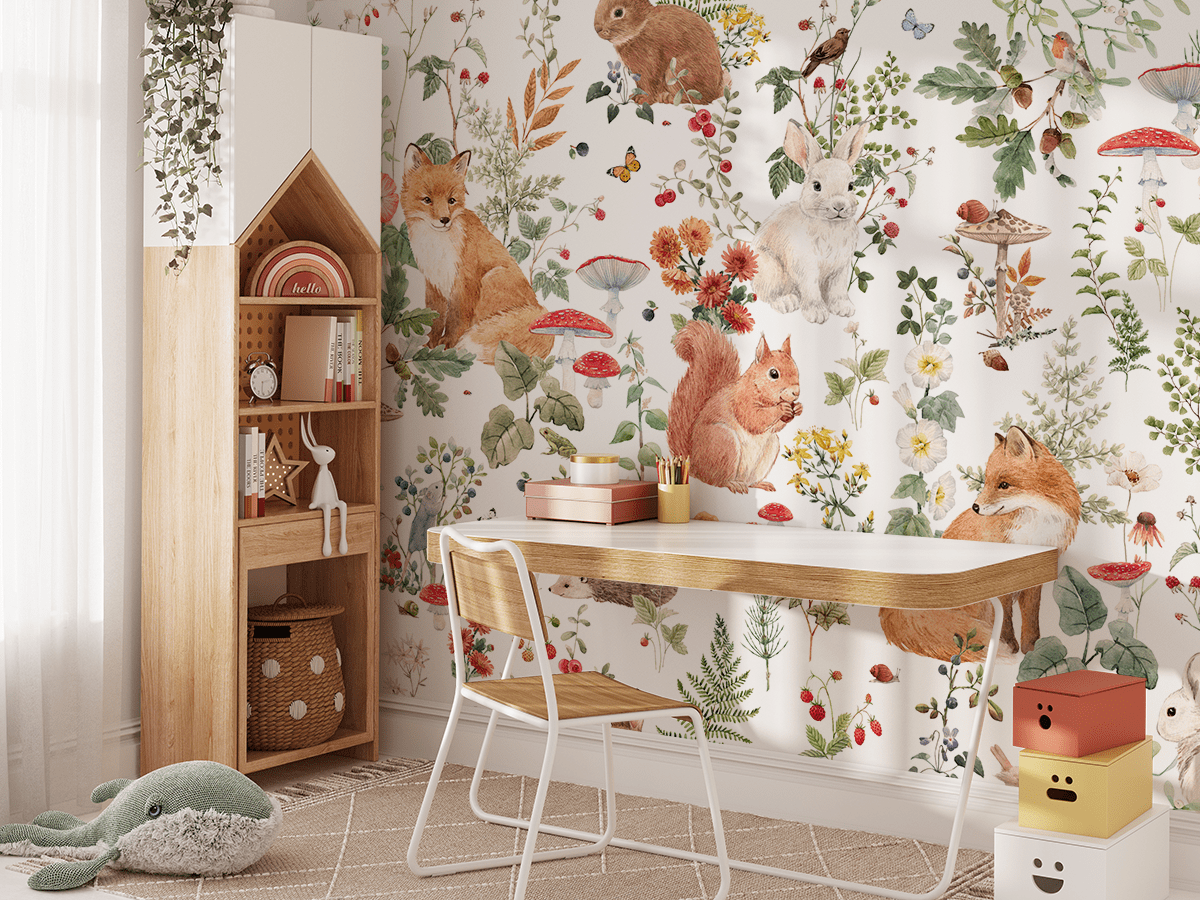 Nježni detalji i vesele boje čine ovu foto tapetu savršenim izborom za dječju sobu, stvarajući topao, ugodan i inspirativan prostor za igru, učenje i opuštanje. To je odličan način da u svoj interijer unesete prirodni šarm šume i prirode.
