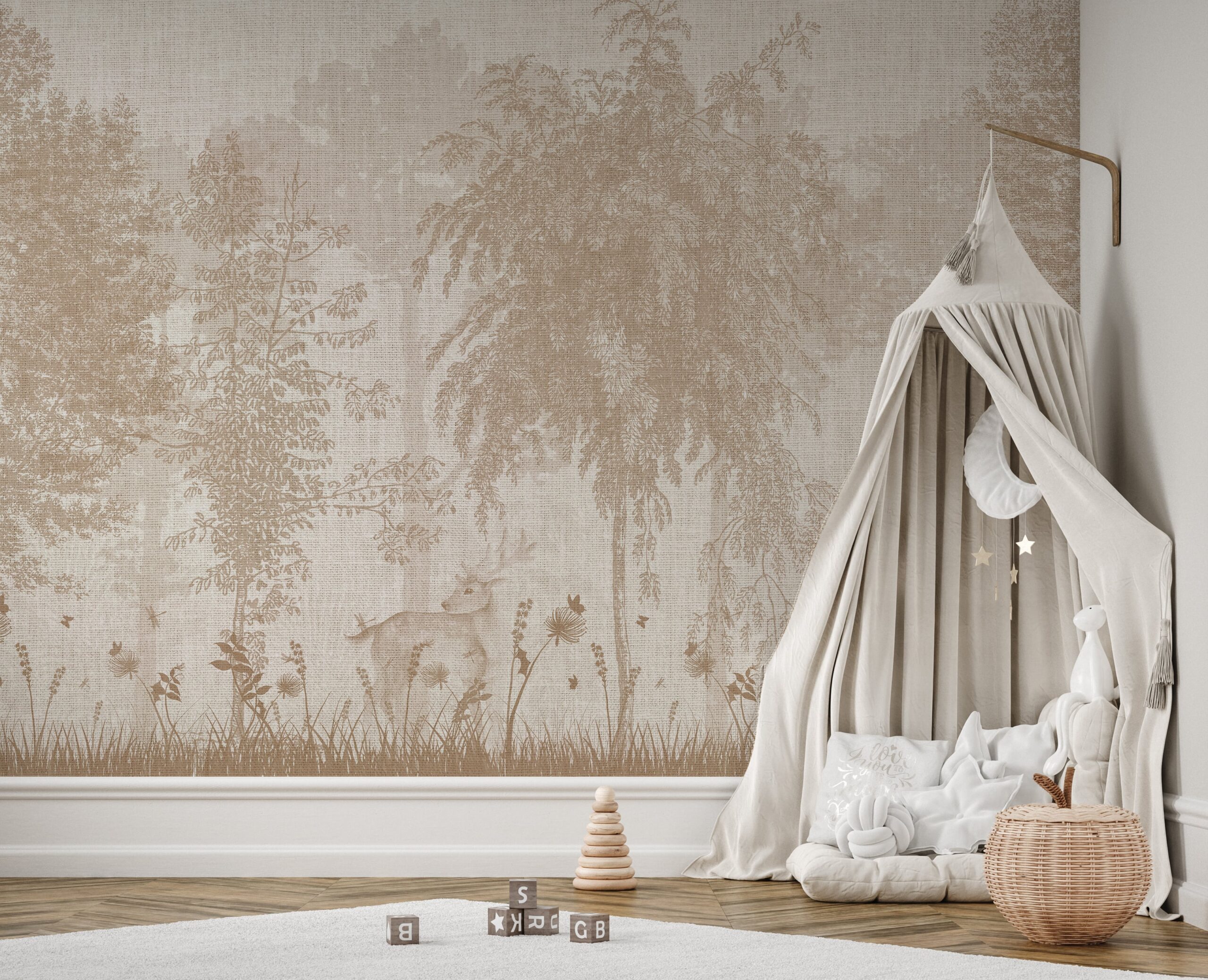 Pretvorite dječju sobu u čarobni kutak uz zidnu fototapetu “Među jelenima”. Ovaj šarmantni, atmosferski uzorak prenosi mališane u začaranu šumu, gdje nježni jeleni šetaju među visokim drvećem, a leptiri i vretenca plešu okolo. Prigušene, tople boje i nježna linija daju interijeru ugodan i miran, bajkovit karakter.