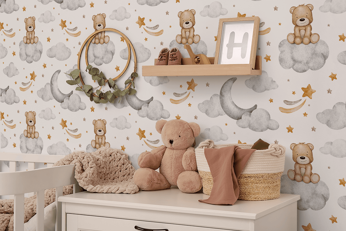 Unesite čarobnu atmosferu u dječju sobu zidnom tapetom “Medvjedić na oblaku”. Ovaj slatki dizajn s medvjedićem koji sjedi na mekom oblaku, okružen zvijezdama, mjesecom i nježnim oblacima, prenosi vašeg mališana u bajkovit, miran svijet snova i avantura. Tople boje i prijateljski motivi stvaraju prostor pun nježnosti i sigurnosti.