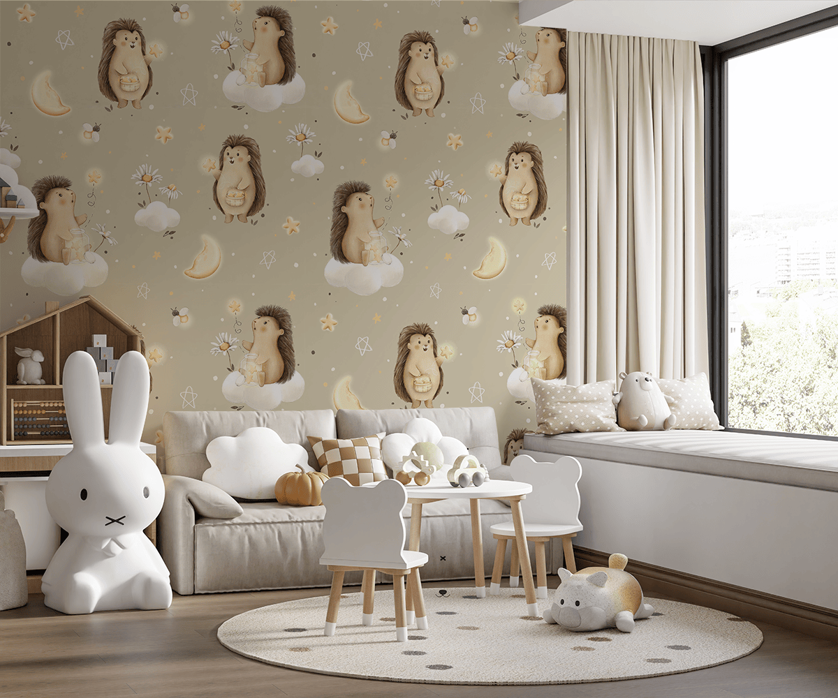 Unesite čarobnu atmosferu u dječju sobu s foto tapetama “Mjesečevi ježevi”. Ovaj šarmantni uzorak s prijateljskim ježevima, svjetlećim zvijezdama i pahuljastim oblacima prenosi najmlađe u bajkoviti svijet snova i noćnih avantura. Tople, pastelne boje i meke ilustracije stvaraju ugodan prostor u kojem se dijete osjeća sigurno i radosno.