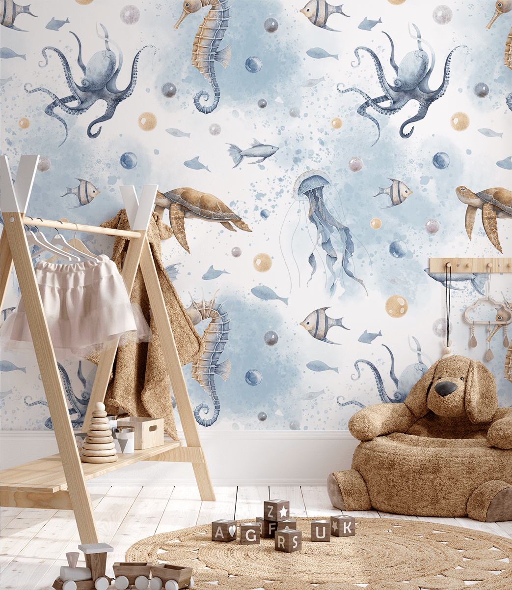 Unesite jedinstvenu atmosferu u svoj interijer foto tapetom “Morske tajne”. Ova suptilna, akvarelna ilustracija prikazuje podvodni svijet pun riba, meduza, kornjača i hobotnica, koje prostor obavijaju mirom i tajanstvenošću. Nježne nijanse plave i pastelne boje stvaraju atmosferu opuštanja, idealnu za dječje sobe, vrtiće ili prostore pune mašte.