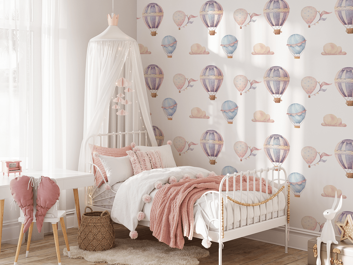 Pretvorite dječju sobu u čarobnu zemlju uz foto tapetu “Pastel Sky Dreams”. Ovaj nježni uzorak s balonima na vrući zrak i mekim oblacima, u pastelnim nijansama ružičaste, ljubičaste i plave, stvara ugodan i sanjiv prostor. Ilustracije akvarelom vode najmlađe na uzvišeno putovanje puno mira, radosti i mašte.