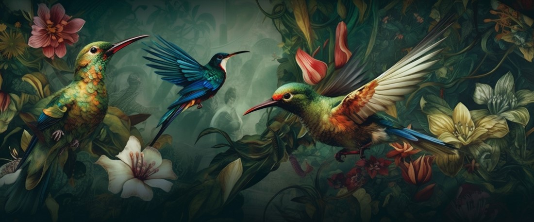 Tapeta “Ples kolibrića u džungli” – egzotična lakoća, šarena dinamika i čarobni šarm prirode