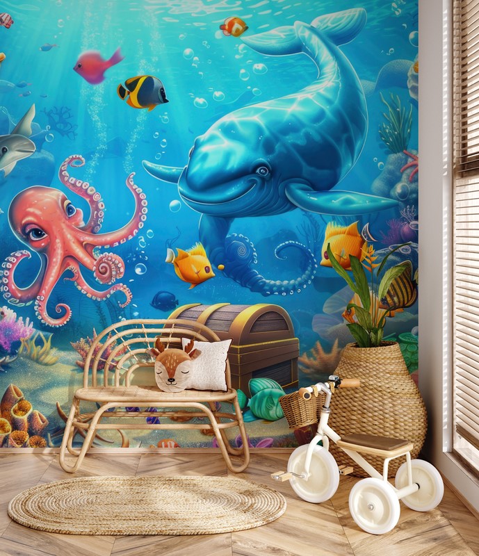 Tapeta “Podvodna avantura s morskim stanovnicima” – bajkovit svijet, morska čarolija i veseli ukras za dječju sobu