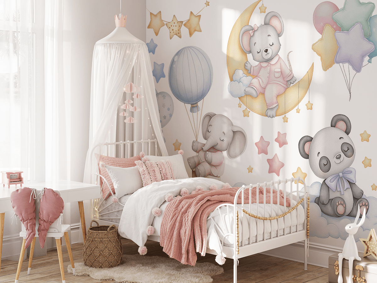 Unesite atmosferu mira i nježnosti u dječju sobu uz foto tapetu “Uspavane životinje”. Ova jedinstvena ilustracija prikazuje preslatke, usnule životinje – miša na mjesecu, slona u balonu i medvjedića na oblaku – okružene pastelnim zvijezdama, balonima i mekim oblacima. Suptilne boje i prijateljski likovi stvaraju skladan, umirujući prostor, savršen za odmor i sanjarenje.