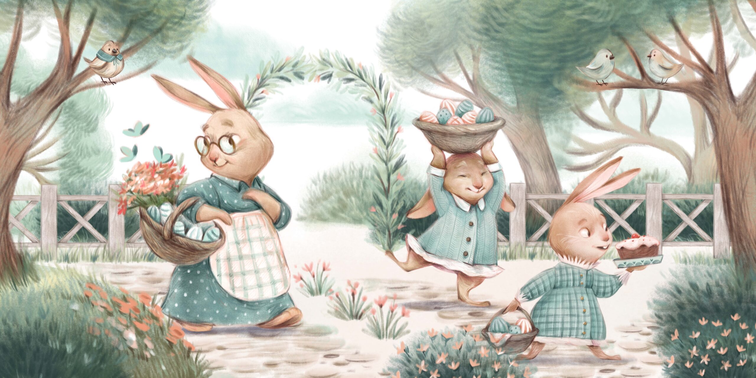 Foto tapeta “Proljetni zečići” – Radosna zabava, proljetna atmosfera i šarmantan ukras za dječju sobu