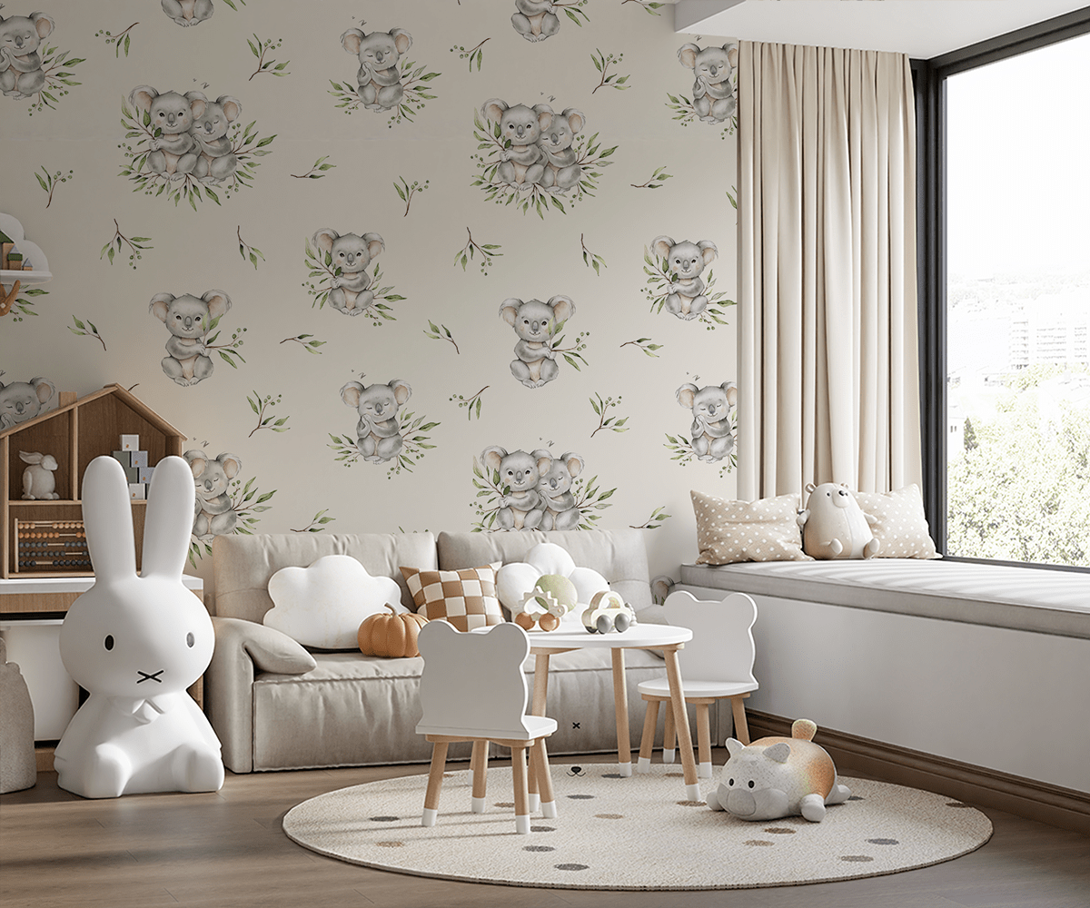Foto tapeta San o eukaliptusu – šarmantni svijet koala, nježna igra i topla atmosfera dječje sobe