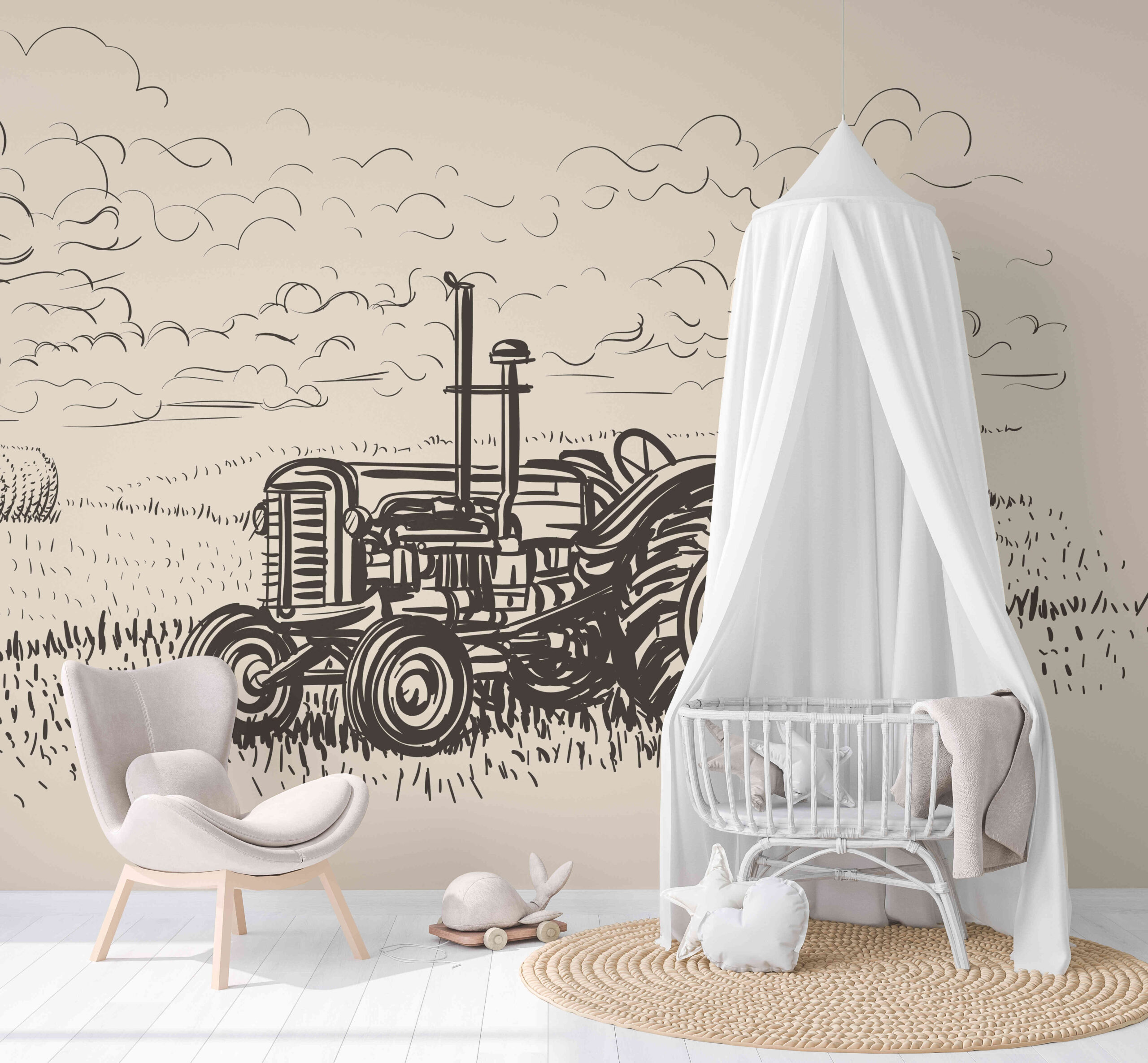 Unesite jedinstvenu atmosferu u svoj dom uz foto tapetu “Rural Nostalgia”. Ova zamršeno izrađena skica traktora na pozadini polja s balama sijena evocira uspomene na jednostavnost i sklad seoskog života, dajući prostoru toplu i ugodnu atmosferu. Suptilni, monokromatski stil savršeno se uklapa u klasične i moderne dizajne interijera.
