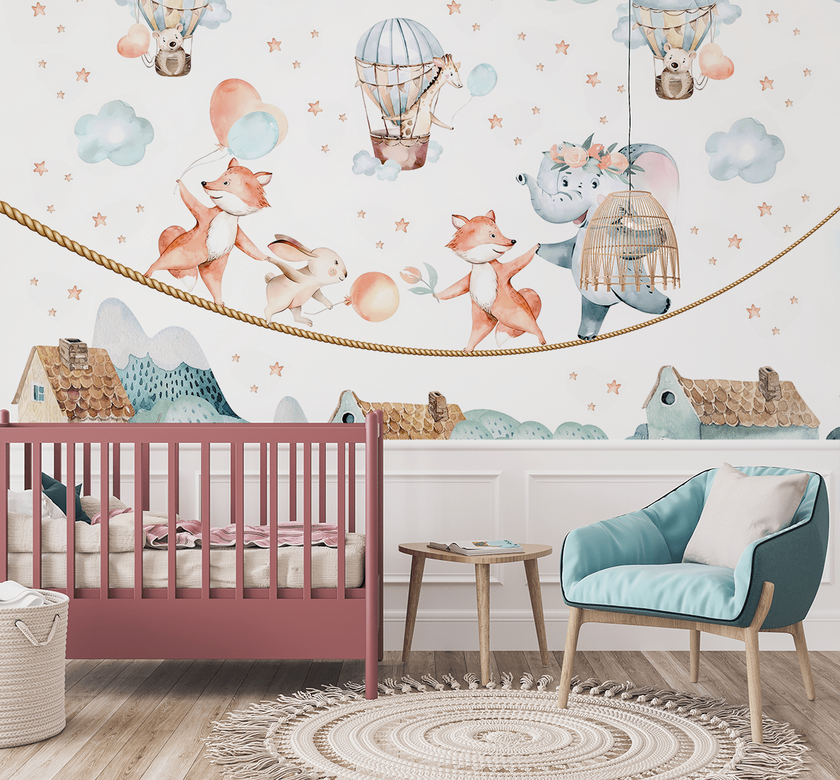 Uvedite jedinstveni svijet pun šarenih balona, slatkih životinja i mekih oblaka u dječju sobu uz foto tapetu “Hodanje po oblacima”. Ovaj nježni, pastelni uzorak vodi vas u zemlju mašte, gdje je svaki dan pun zabave i prijateljstva. Jarke boje i nježni oblici stvaraju atmosferu mira i bezbrižnosti, savršenu za mališane.