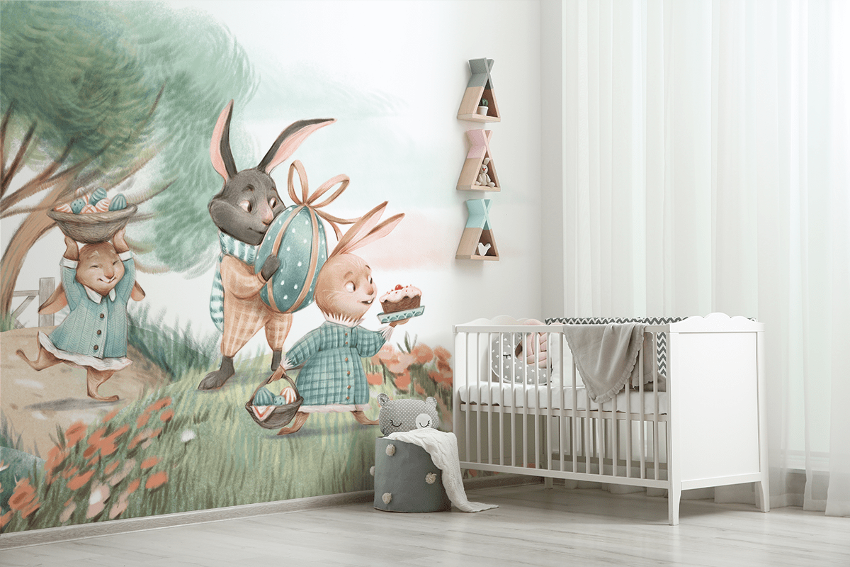 Foto tapeta “Sretni zečići” – šarena avantura, veselo raspoloženje i šarmantan ukras za dječju sobu