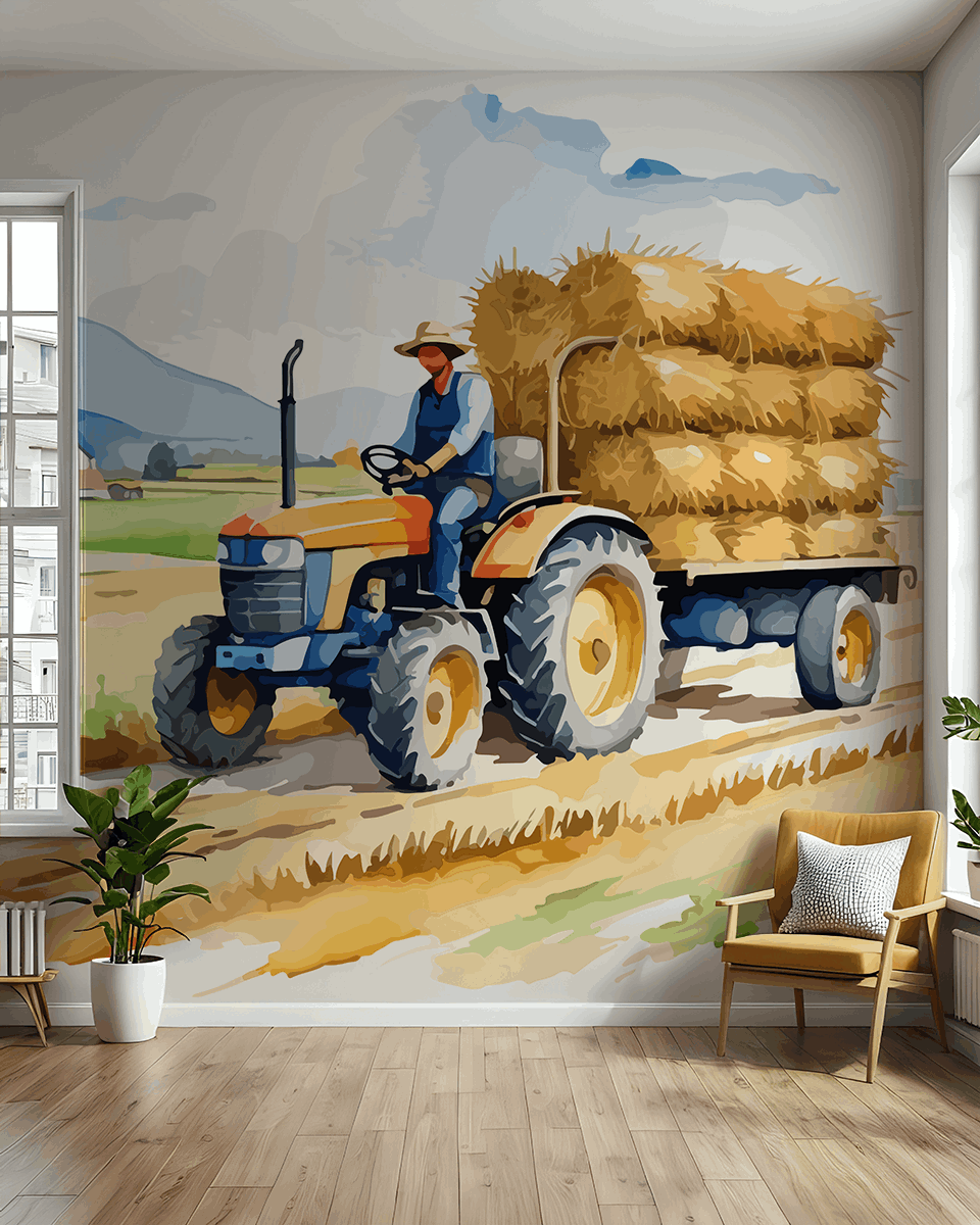 Unesite jedinstvenu atmosferu u svoj dom foto tapetom “Slamnati put”. Ovaj živahni, slikarski motiv s traktorom među poljima i balama sijena prenosi vas ravno na mirnu seosku cestu, unoseći u interijer atmosferu idile i prirodne ljepote. Tople nijanse zlatne i nježna igra svjetlosti stvaraju osjećaj ugode koji savršeno nadopunjuje rustikalne i moderne aranžmane.