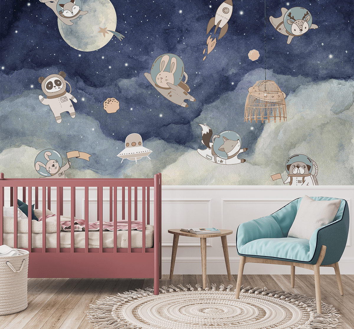 Unesite nevjerojatnu atmosferu u dječju sobu foto tapetom “Životinje iz svemira”. Ova šarena i detaljna ilustracija prikazuje slatke životinje u svemirskim odijelima, kako lebde među zvijezdama, planetima i raketama. Bajkoviti krajolik razvija maštu i potiče snove o svemirskim putovanjima, stvarajući prostor pun radosti i avanture.