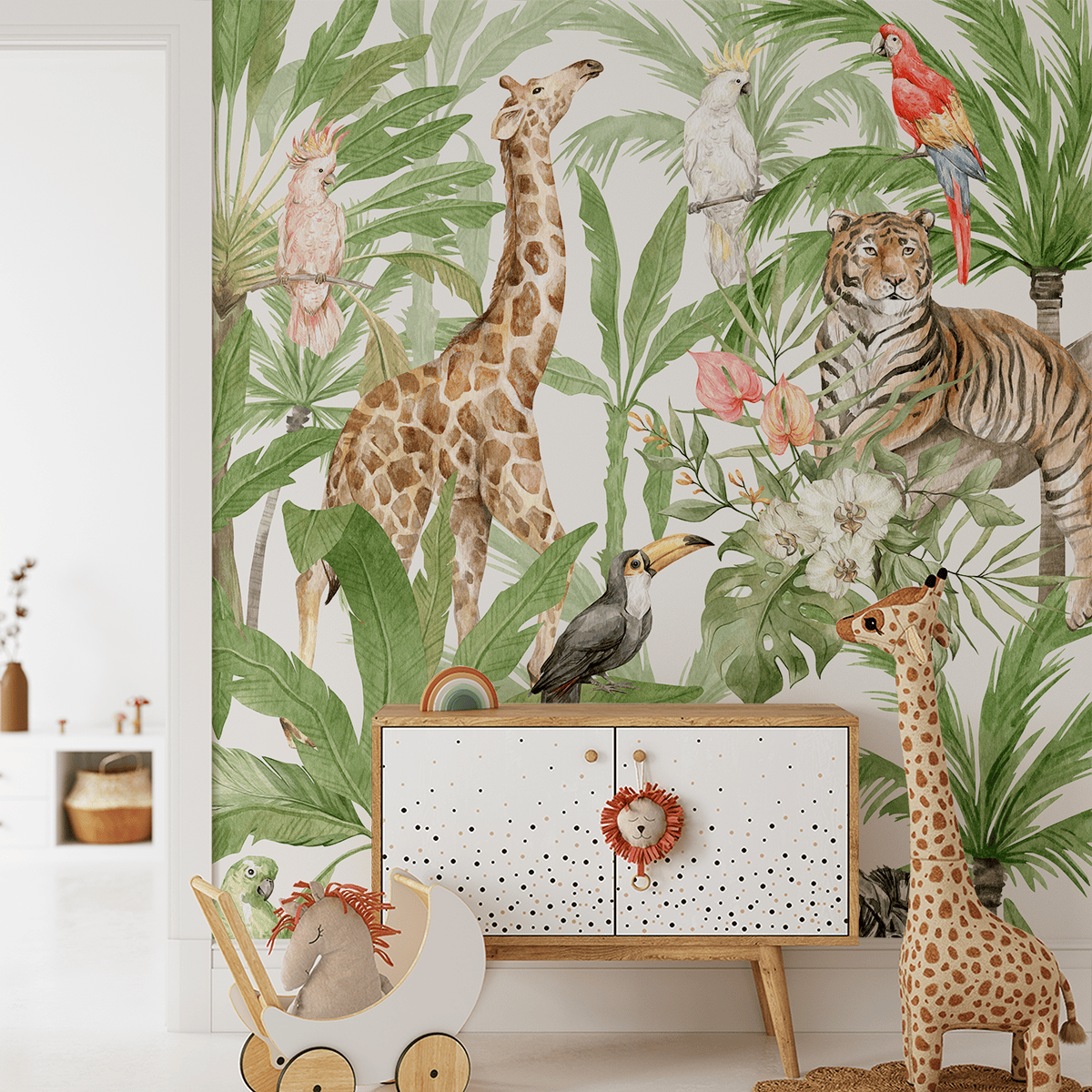 Zaronite u čarobni svijet tropa s foto tapetom “Tropska odiseja”. Puna boja i neobičnih životinja, ova foto tapeta vas prenosi u džunglu kojom dominiraju egzotične ptice, veličanstvene biljke i divlje životinje poput zebri, žirafa i tigrova. Svaki detalj ovog jedinstvenog ukrasa vrvi životom, stvarajući radosnu atmosferu punu avanture i otkrića.
