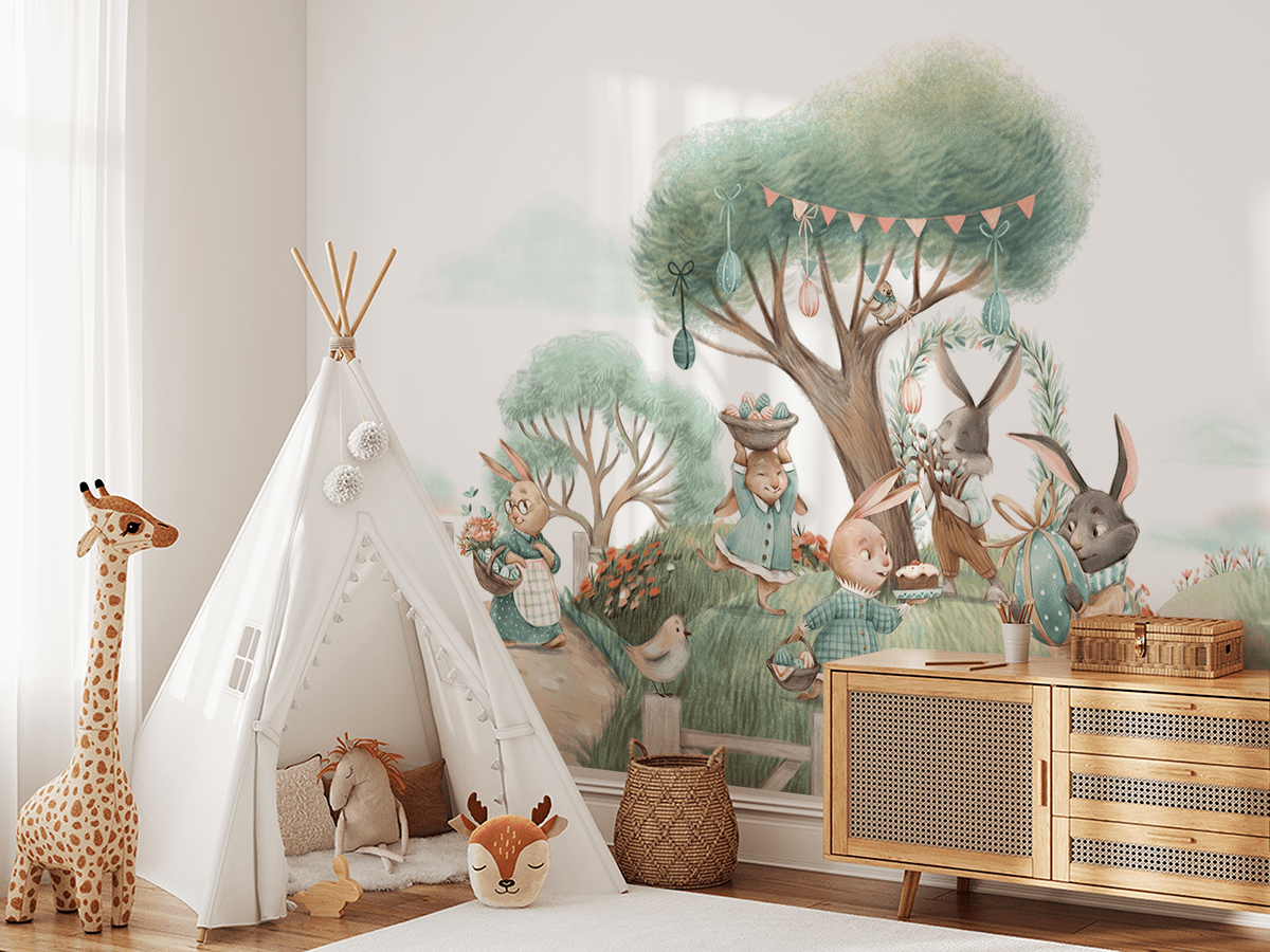 Foto tapeta “Uskrsni zečići” – Radosno proljeće, šareni detalji i šarmantan ukras za dječju sobu