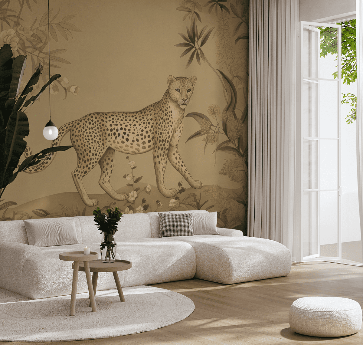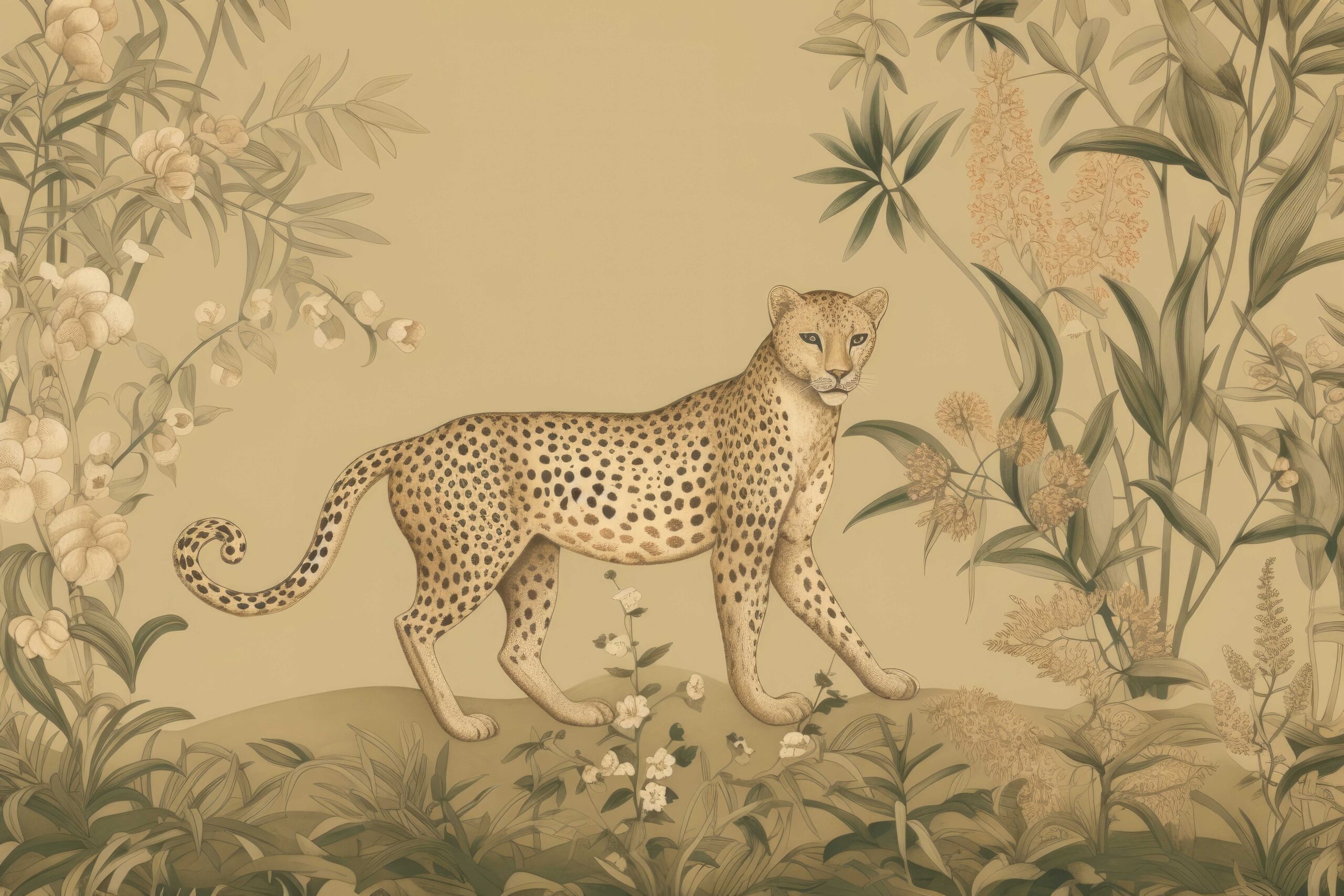 Unesite dašak egzotike i sofisticiranosti u svoj interijer foto tapetom “Gepardov vrt”. Ovaj umjetnički uzorak kombinira veličanstvenu siluetu geparda sa suptilnim, botaničkim sastavom biljaka, stvarajući dekoraciju punu mira, ravnoteže i prirodne ljepote. Topla paleta bež i prigušenih zelenih boja savršeno se usklađuje s klasičnim i modernim aranžmanima.