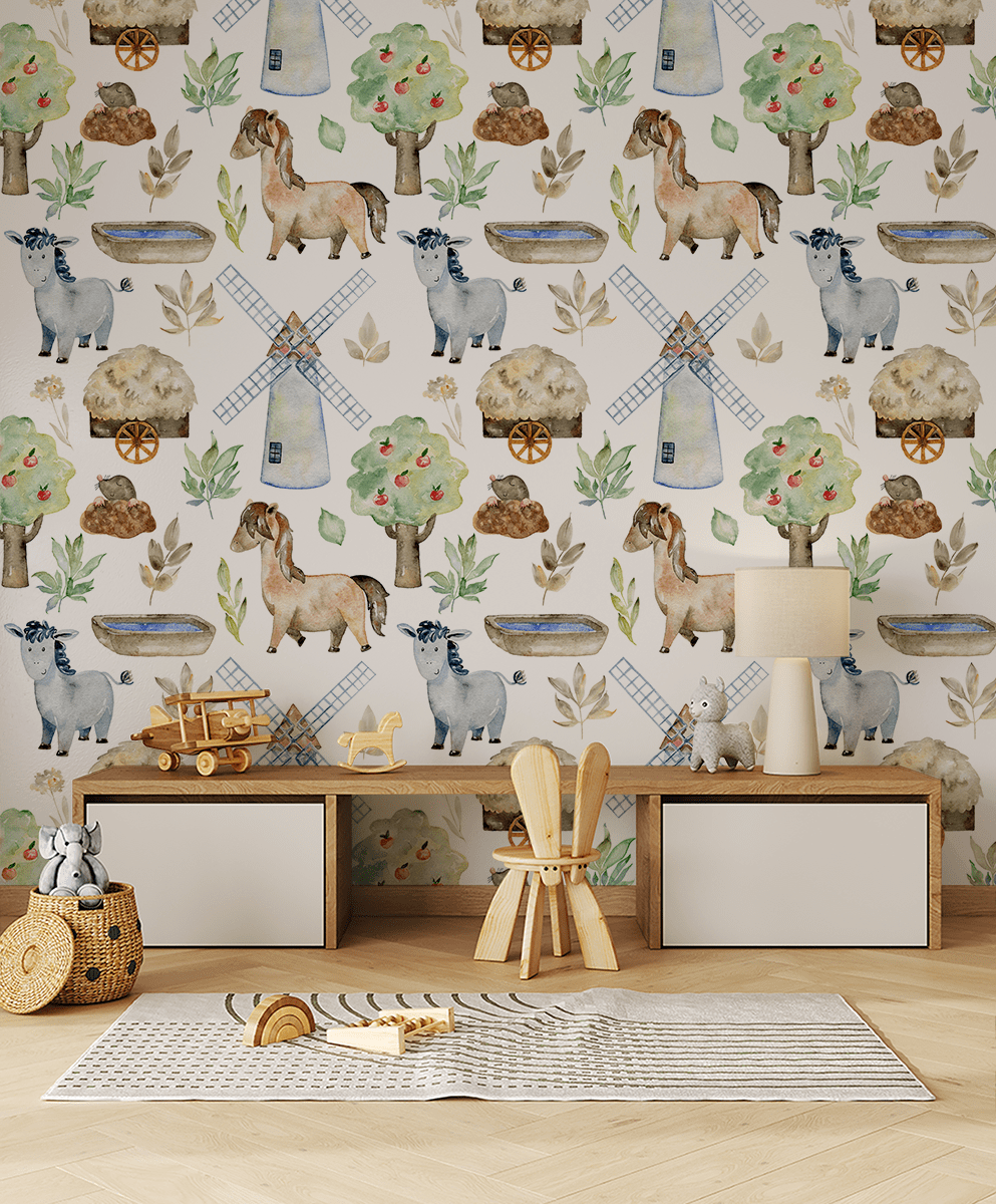 Unesite atmosferu bezbrižne igre u dječju sobu foto tapetom “Začarana farma”. Ovaj šarmantni, akvarelni uzorak prikazuje vesele životinje, mlin, drveće i ruralne detalje, stvarajući idiličan krajolik koji razvija maštu i poziva na avanturu.