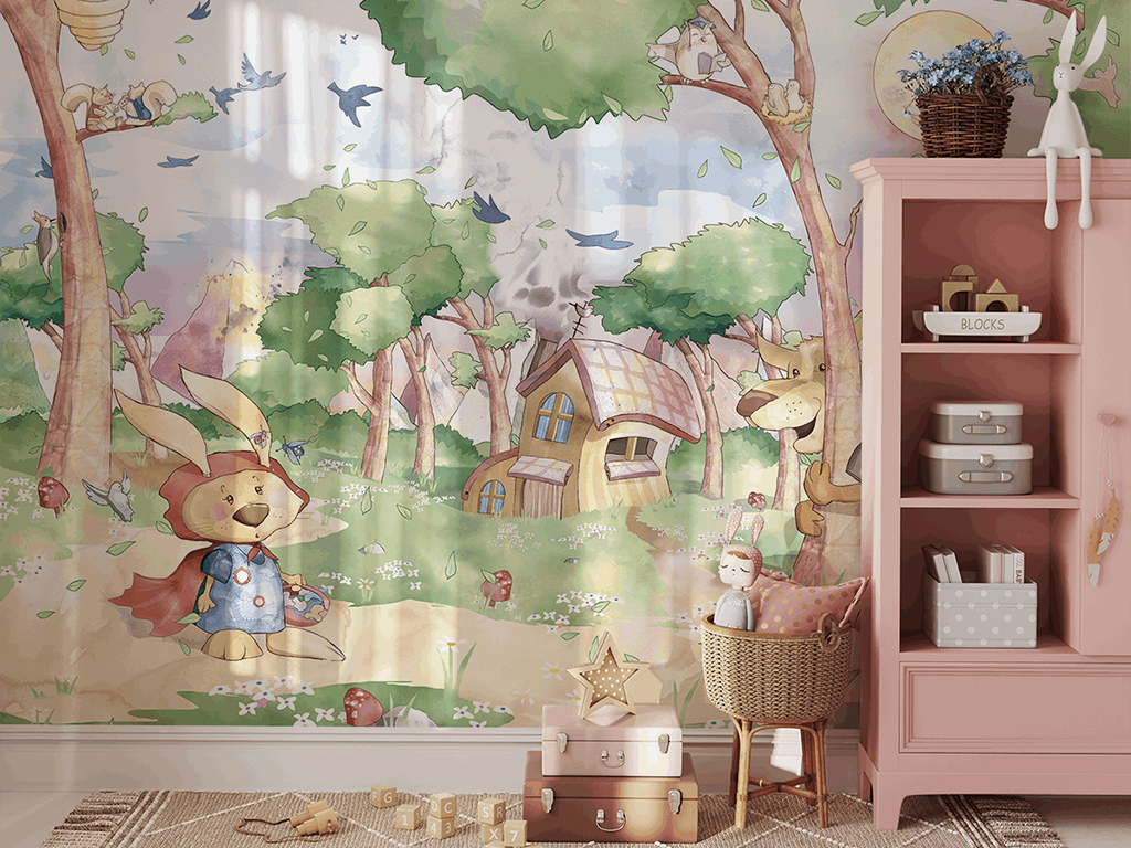 Ova neobična fototapeta vodi vas u svijet bajki, gdje zeko preuzima ulogu Crvenkapice. Ovaj šarmantni prizor, pun topline i suptilnog humora, savršeno nadopunjuje atmosferu dječje sobe, ali će izgledati sjajno i u dnevnoj ili spavaćoj sobi – gdje god želite unijeti malo čarolije i lakoće.