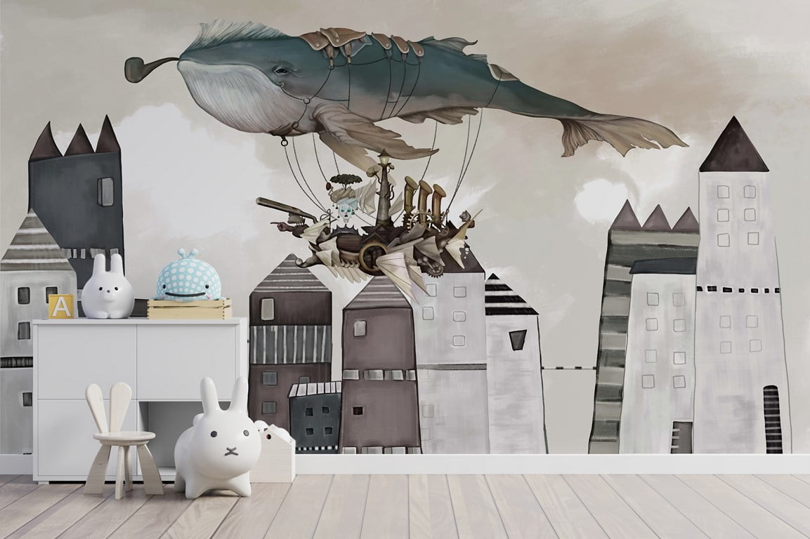 Tražite originalan i kreativan dodatak sobi vašeg djeteta? Ovaj mural s motivom letećeg kita iznad grada zasigurno će ispuniti vaša očekivanja!