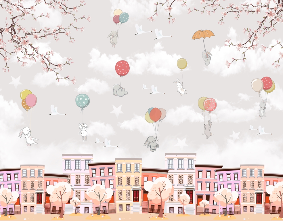 Zidni mural Bunnies Over the Pink City šarmantan je i romantičan ukrasni element koji će vašem interijeru dodati udobnost i delikatnost. Slika prikazuje slatke zečiće koji lebde nad pastelnim, ružičastim gradom, stvarajući čarobnu atmosferu.