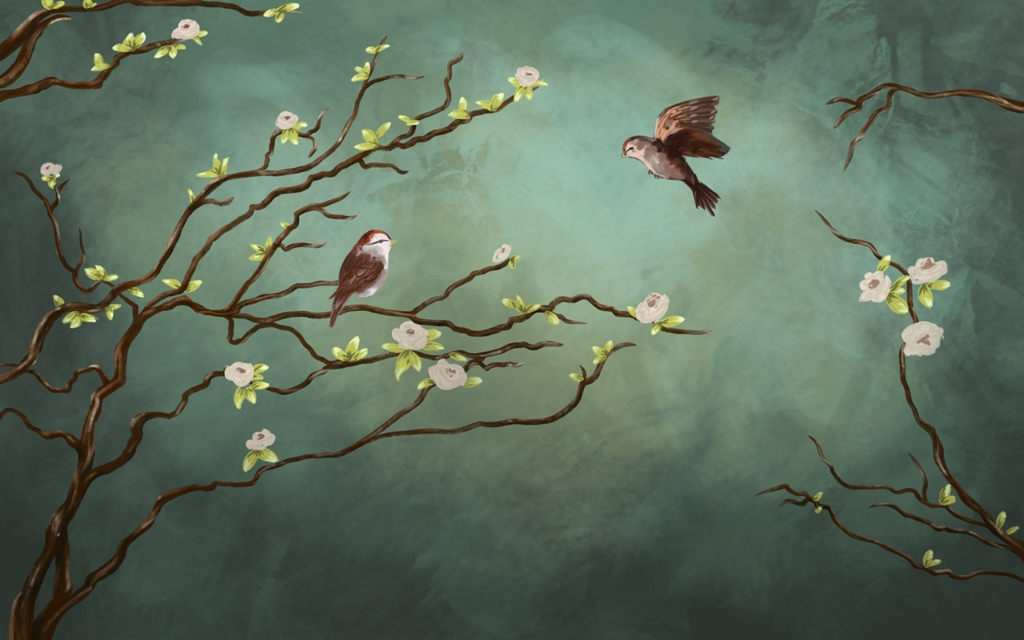 Na ovom visokokvalitetnom zidnom muralu možete vidjeti romantični prizor dviju ptica koje sjede na rascvjetanom drvetu.