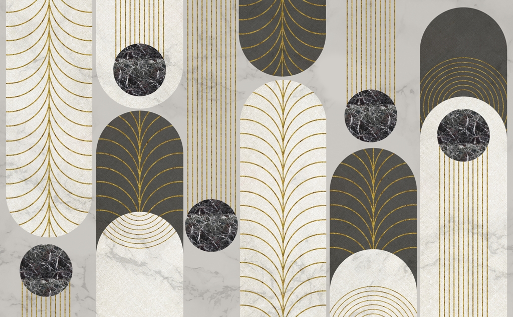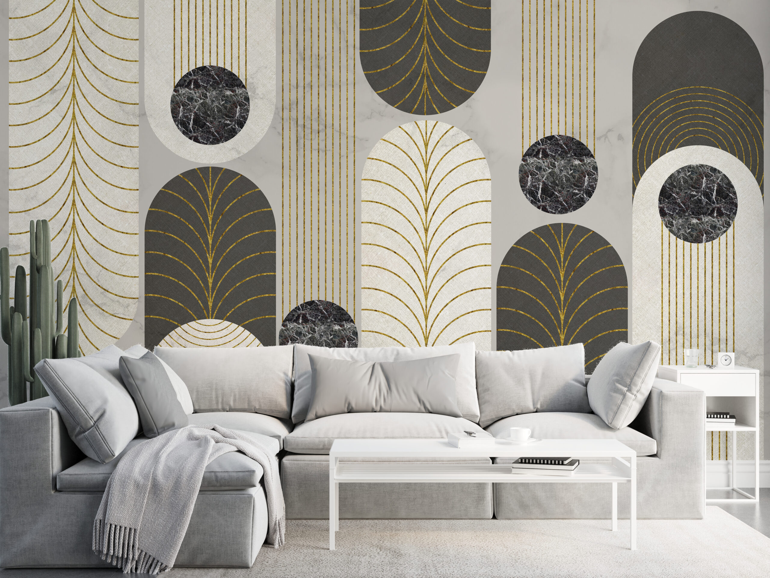 Na ovom zidnom muralu pronaći ćete nježne polukrugove u bijeloj boji, koji su ukrašeni zlatnim akcentima.
