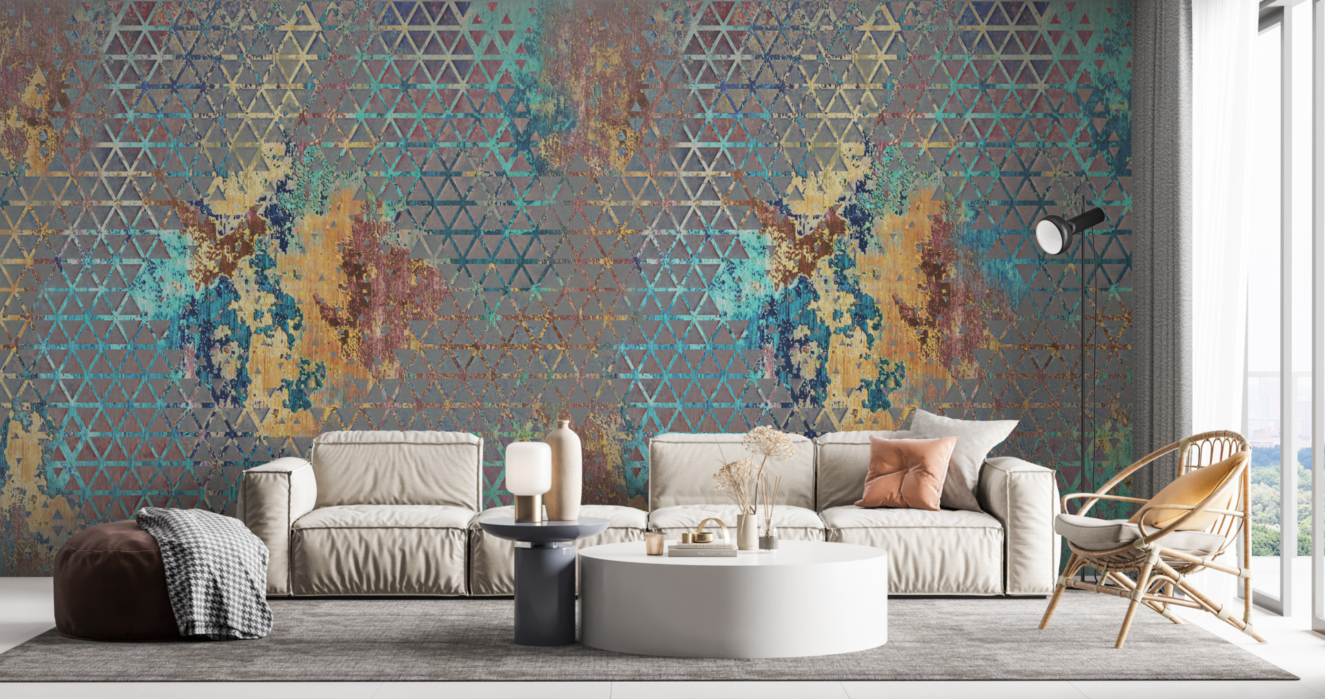 Geometrijski oblici i originalne kombinacije boja učinit će ovaj zidni mural središnjom točkom svakog aranžmana.