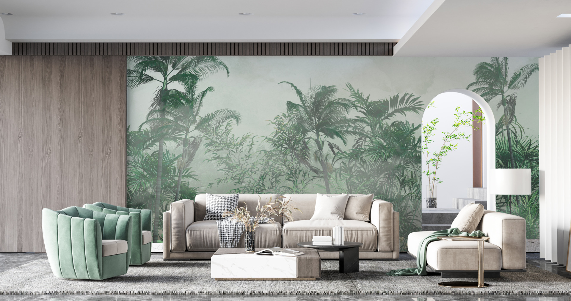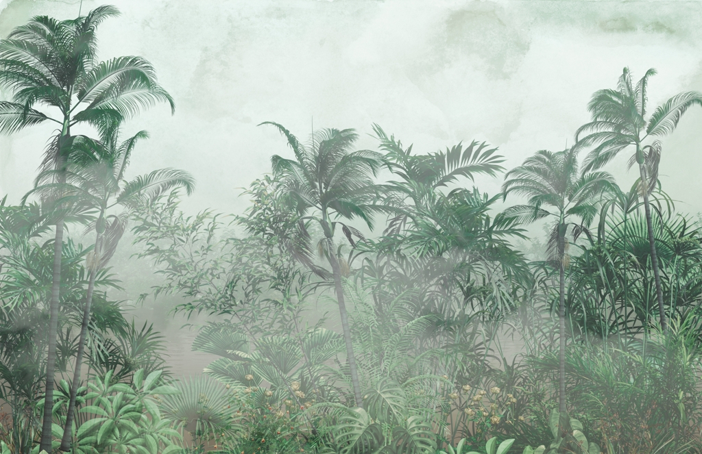 Ovaj neobični zidni mural prikazuje čarobnu atmosferu egzotične magle koja obavija tropsku džunglu.