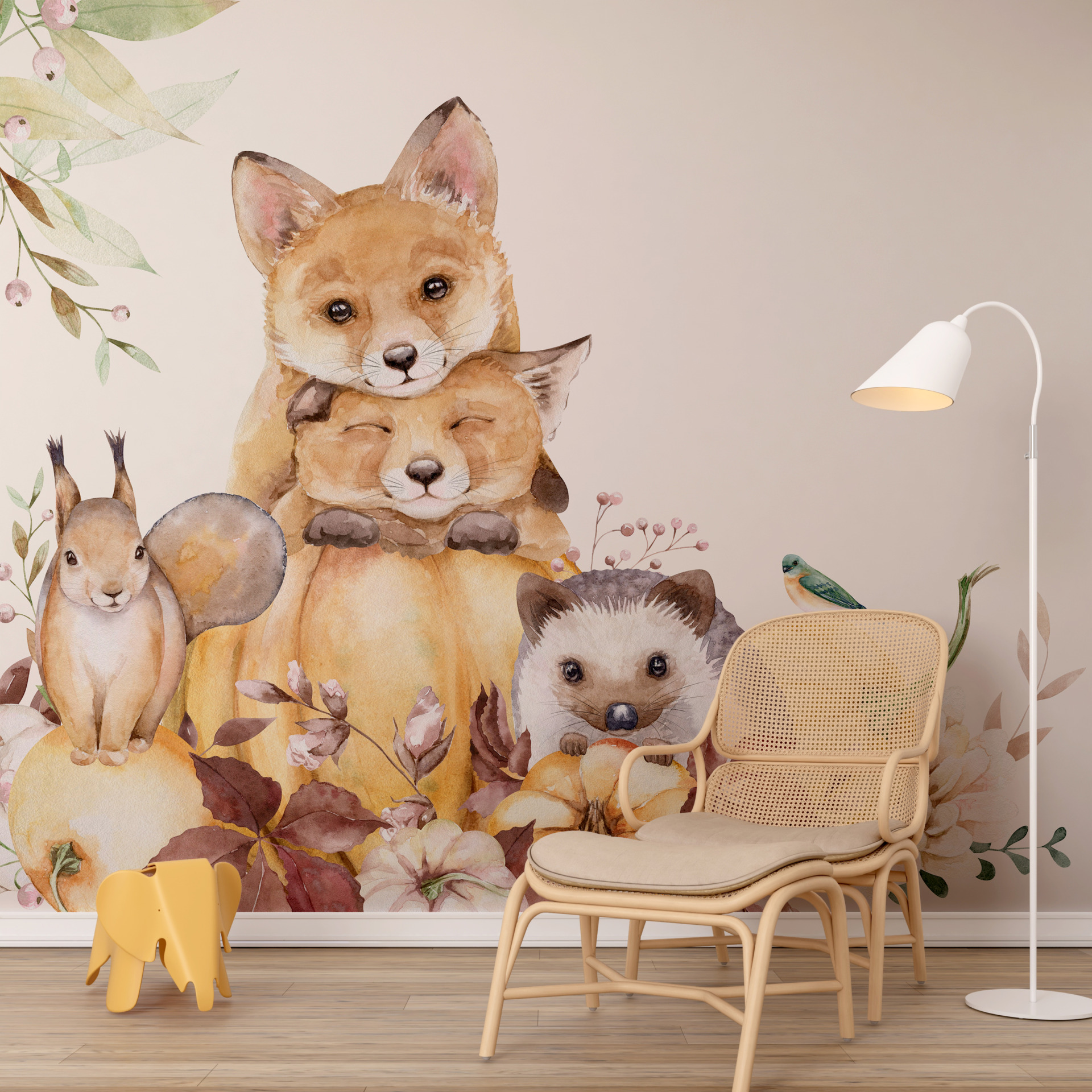 Mural prikazuje razne šumske životinje kao što su ježevi, sove, lisice, jeleni i mnoge druge. Svaki od njih predstavljen je u karakterističnim jesenskim bojama koje će vašu sobu učiniti jedinstveno šarmantnom.