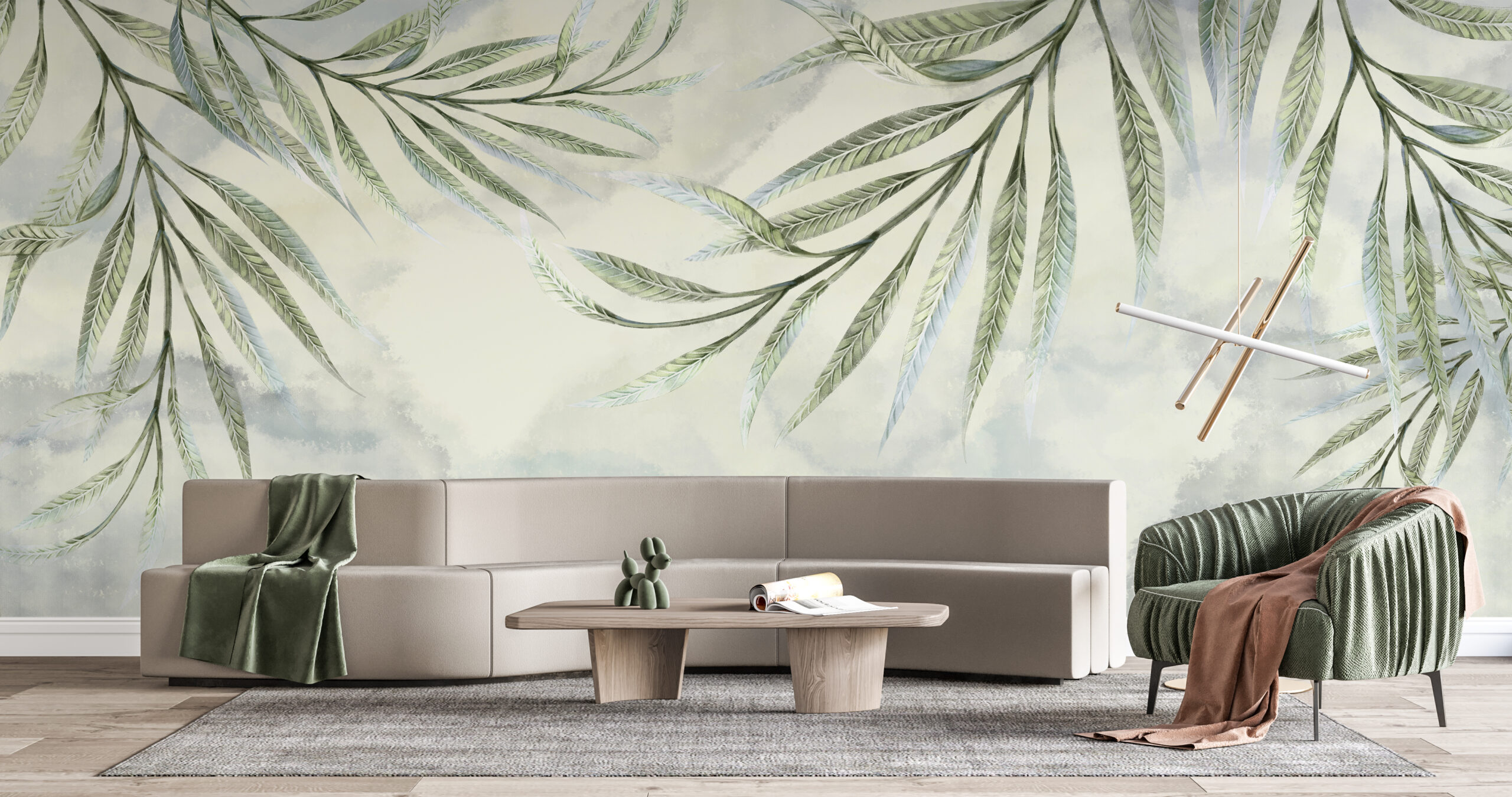 Ovaj šarmantni zidni mural prikazuje maslinove grančice kako plutaju u mekim oblacima na vedrom nebu.