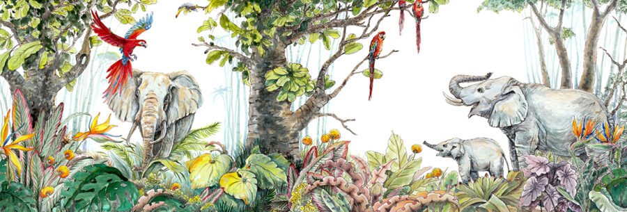 Oživite svoj interijer zidnim muralom Tropical Harmony! Egzotični slonovi, šarene papige i bujna vegetacija u vašem domu čarobna atmosfera džungle. Savršeno za sobu malog putnika! Provjerite sada!