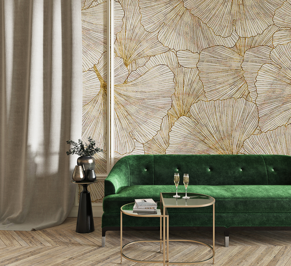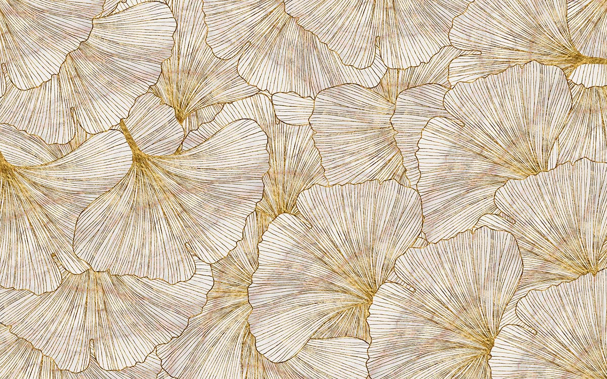 Moderna zidna freska s velikim, stiliziranim listovima ginka (ginka), koji su prikazani u elegantnim nijansama zlatne i bež boje. Listovi imaju nježne, geometrijske linije koje stvaraju trodimenzionalni efekt teksture, dajući interijeru luksuzan, ali prirodan dojam.