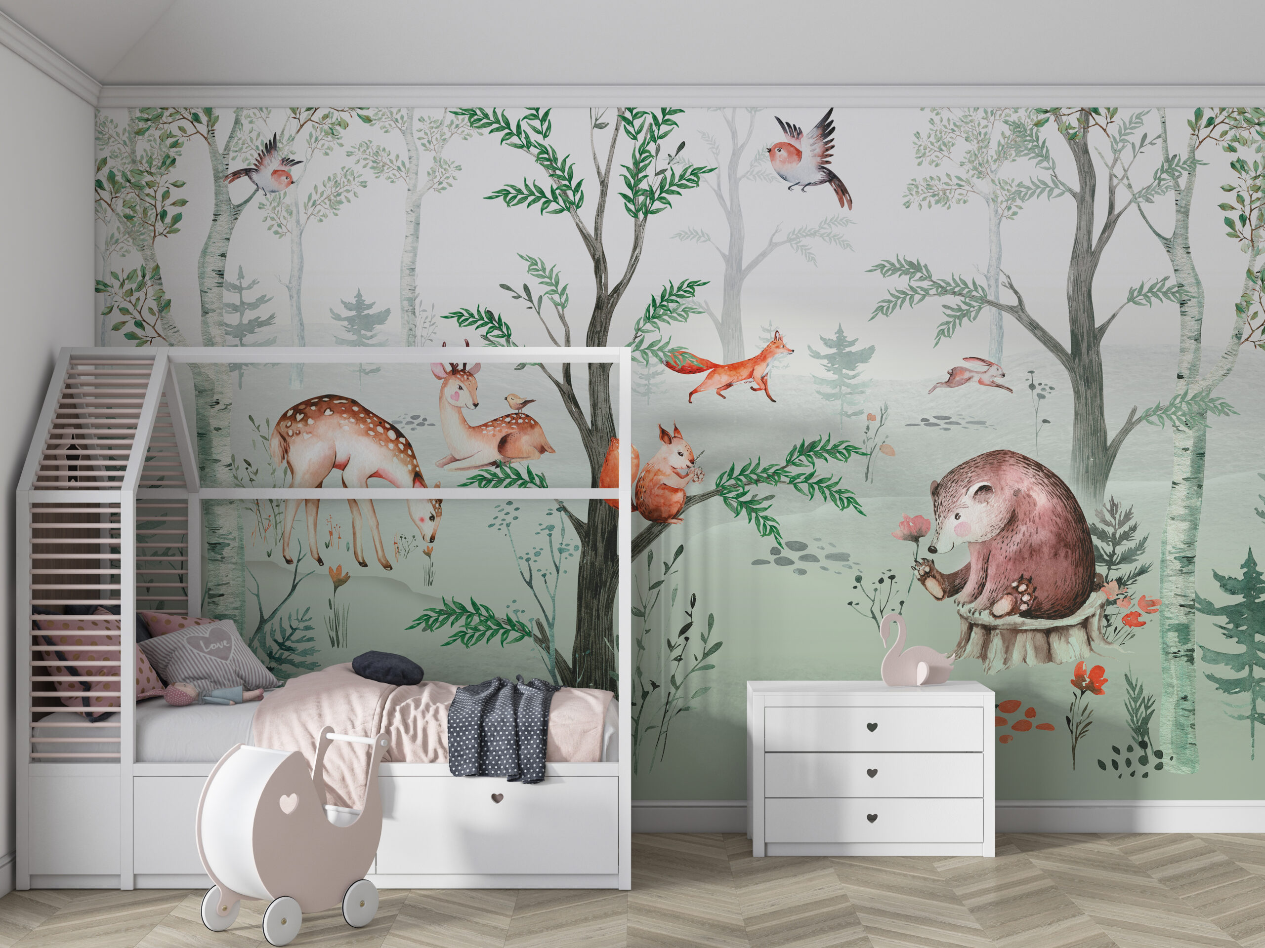 - Šumske životinje prikazane na muralu, poput jelena, lisica, medvjeda ili ptica, dodaju karakter i šarm sobi.