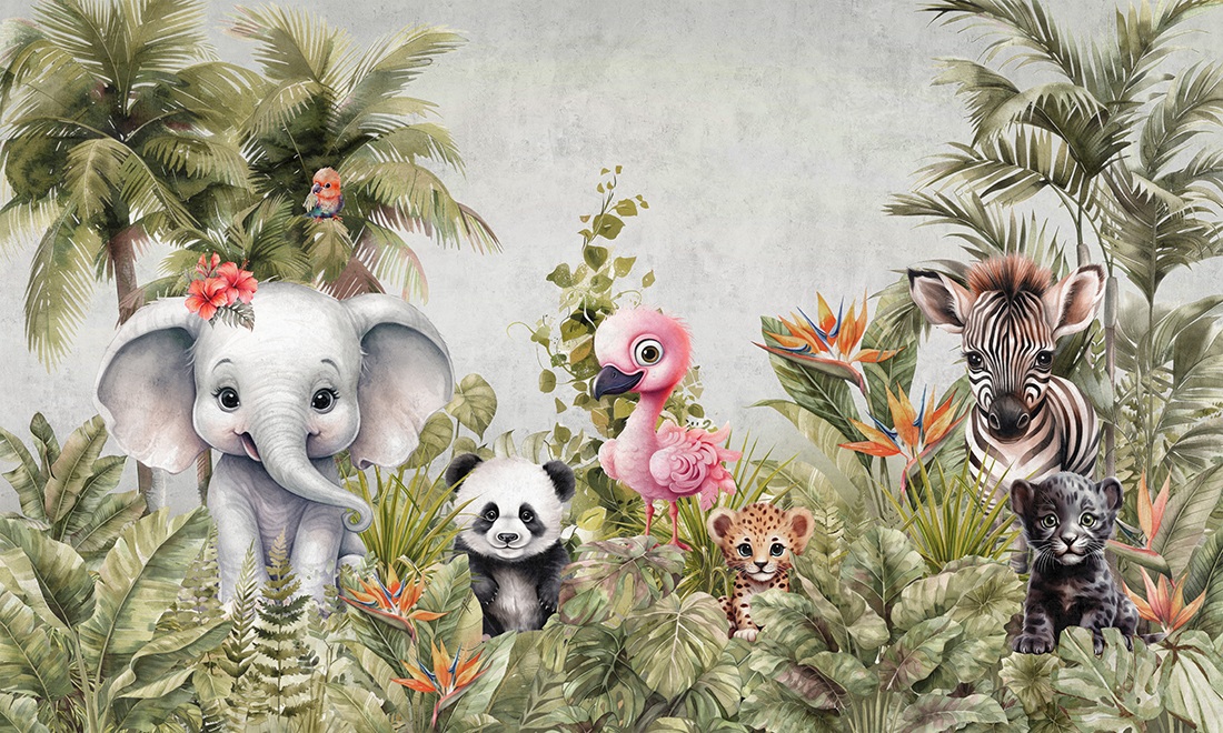 Unesite egzotičnu avanturu u dječju sobu s fototapetom „Životinje iz džungle”. Ovaj šareni motiv prikazuje razne životinje u njihovom prirodnom, tropskom staništu, što potiče znatiželju i potiče ih na istraživanje prirodnog svijeta.